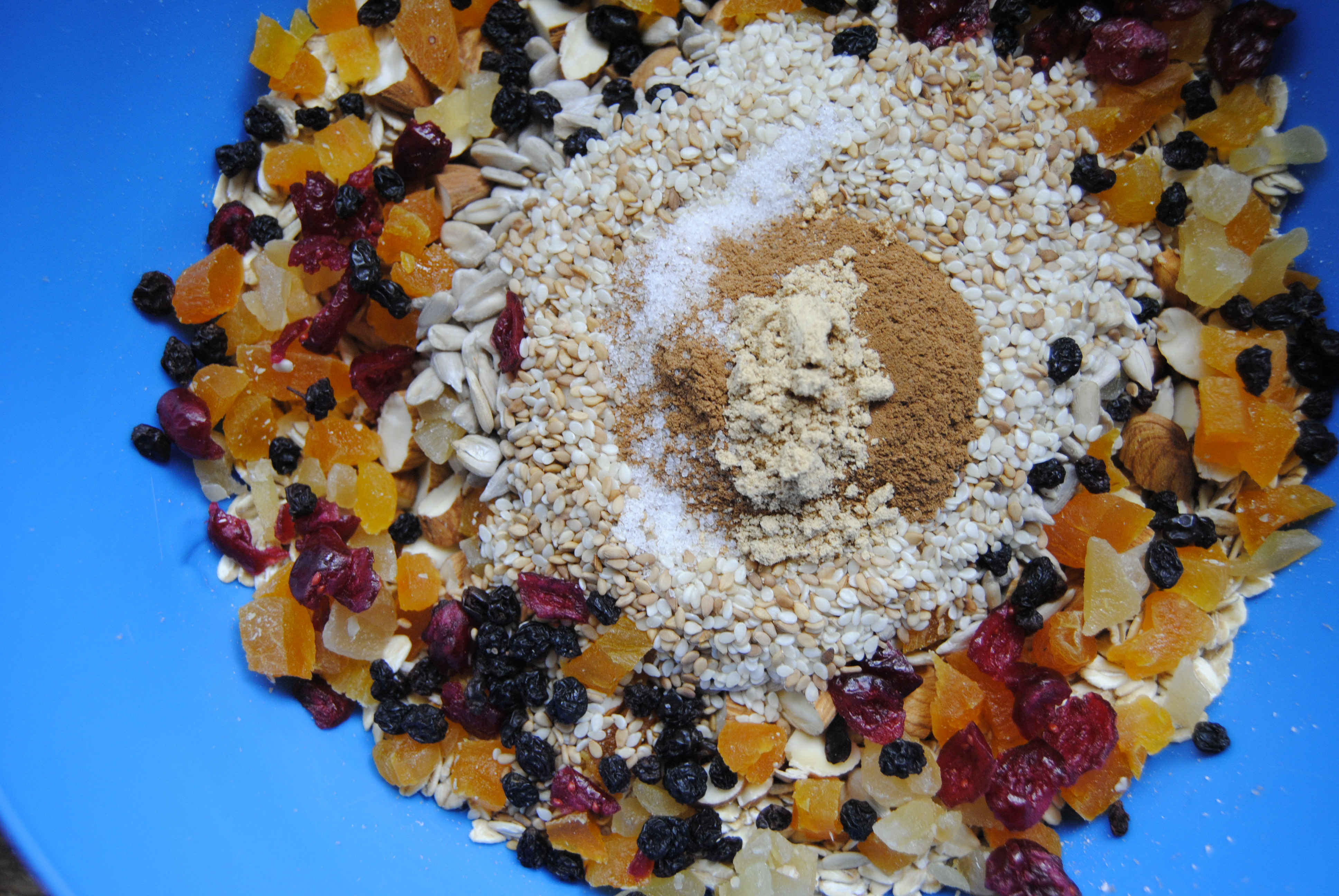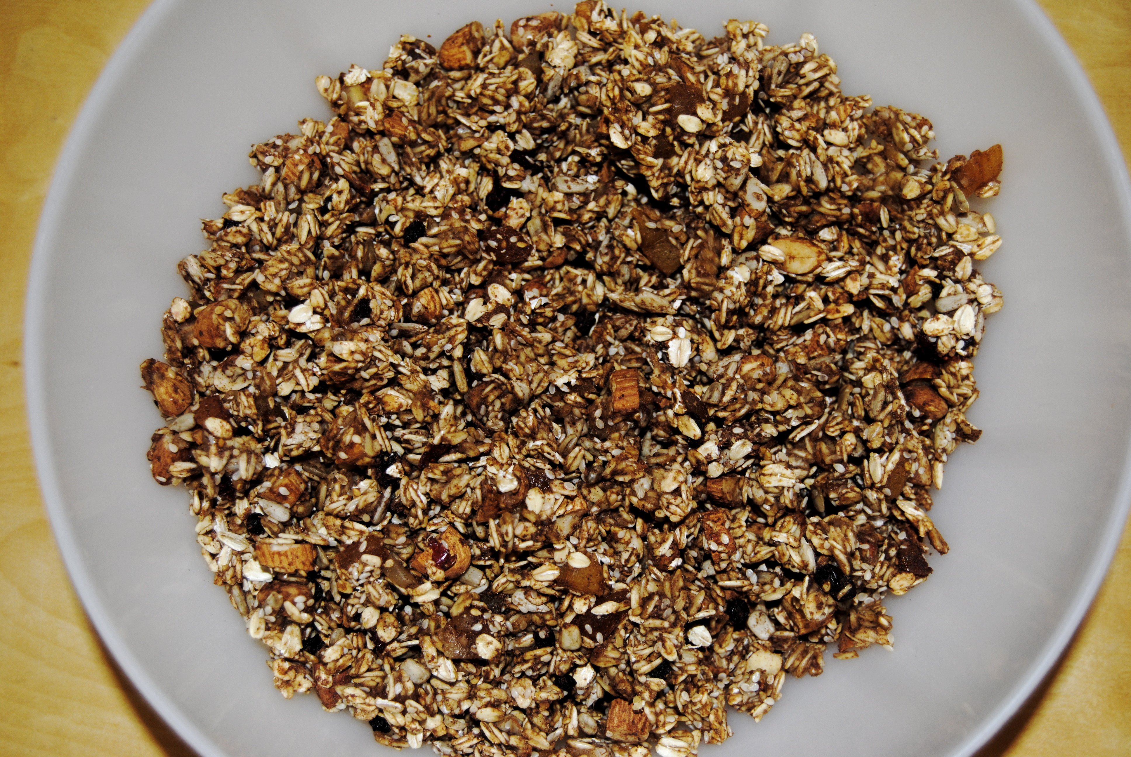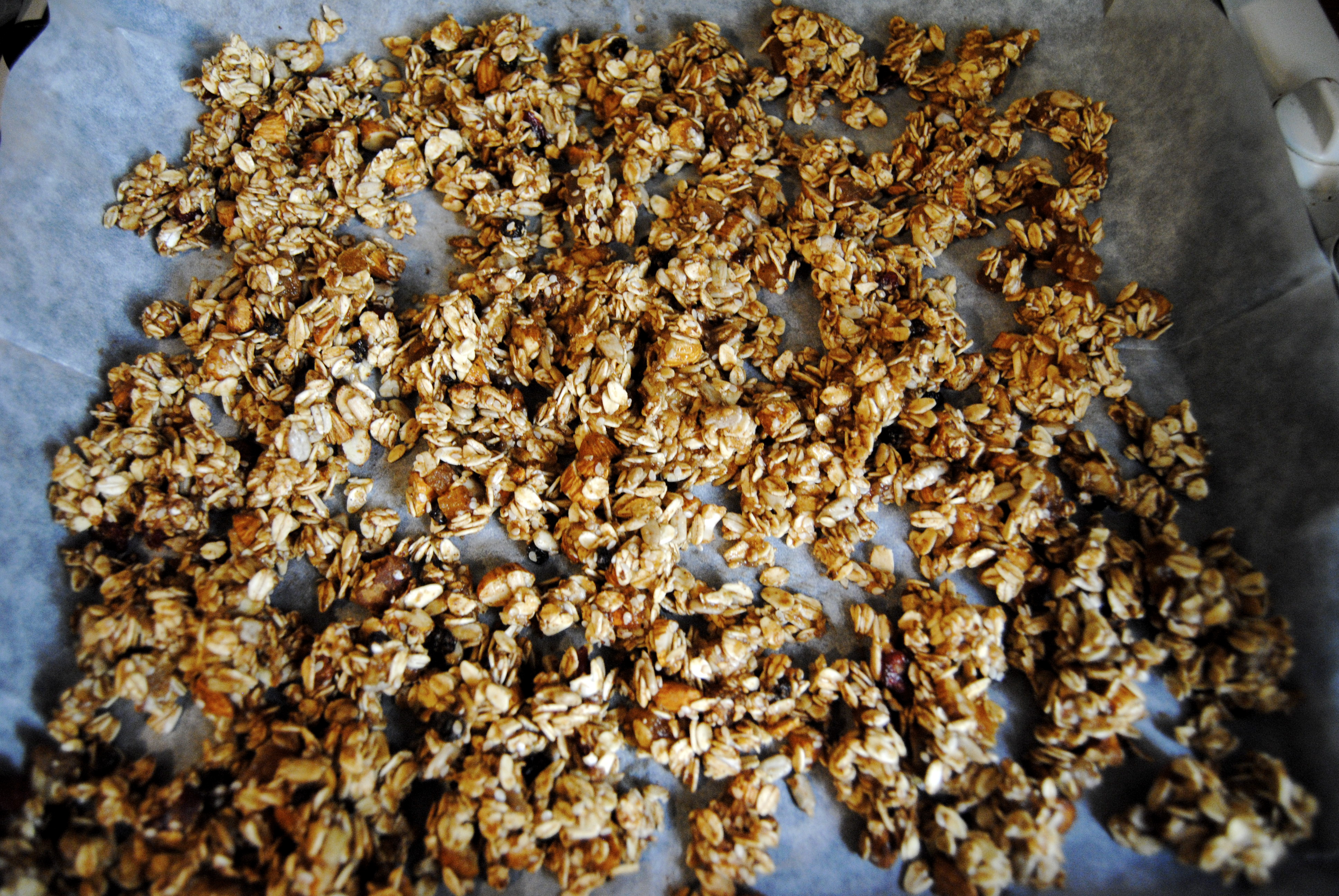 Mix it into the dry ingredients and combine very well. Heat oven to 325 degrees and lay granola onto parchment paper.