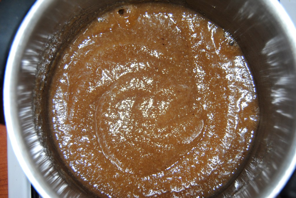 Mix up the dry ingredients well. On low, heat up the applesauce and date honey over low heat. We don’t want to boil it, just get it a little warm.