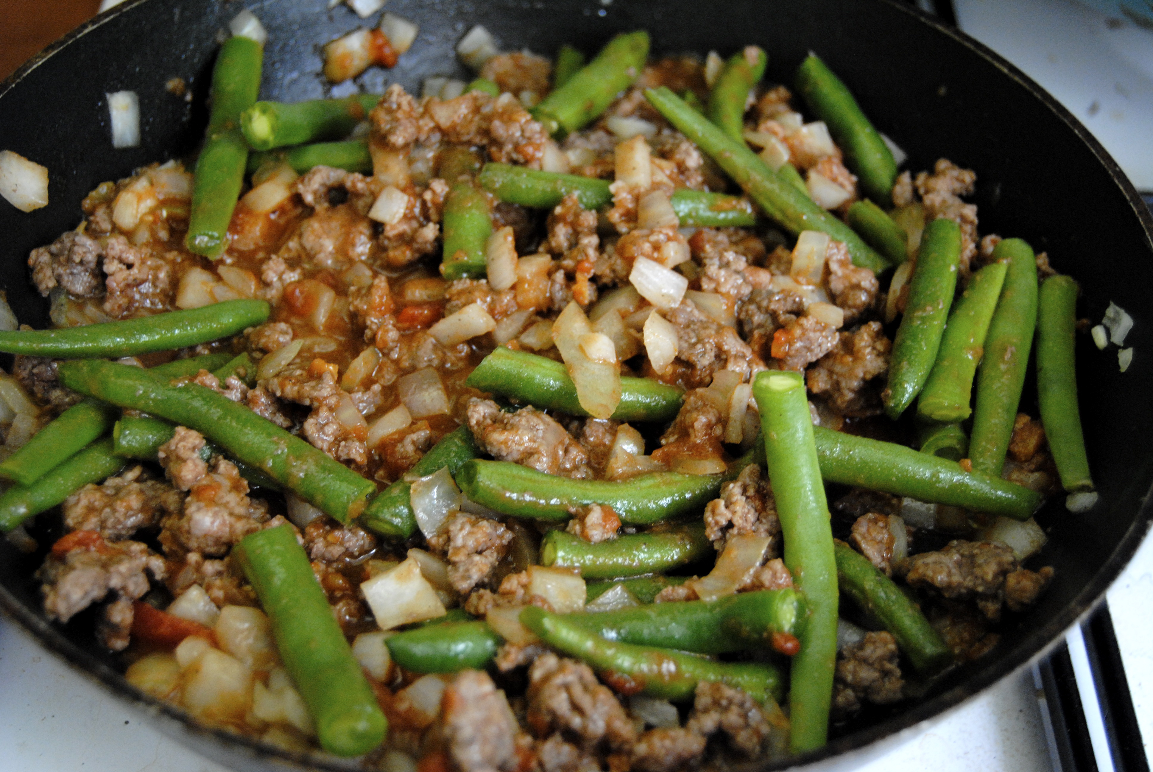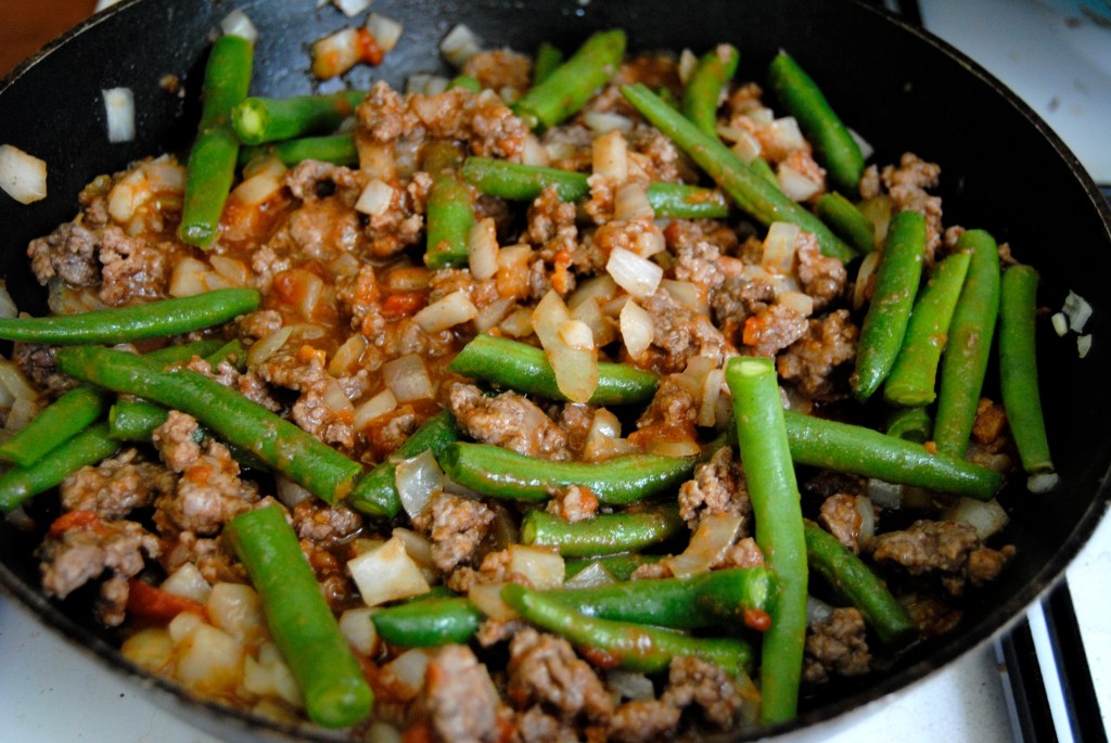 Once it looks cooked, add your tomato paste, green beans and cinnamon and combine well. Set aside.