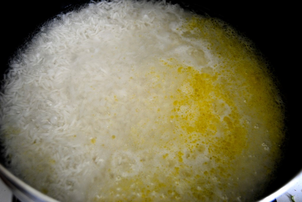I’m not going to get into the knitty gritty of Persian rice preparation. Persian rice requires patience, care and can be very tempermental, even for experienced cooks. Dare I say Persian rice is an awful lot like a woman? Feminists: deep breath. I will say that it helps to soak your rice in water with a little salt for an hour or a few hours before cooking it. If you can’t, then don’t. Nothing will happen. But it’s part of the method and ends up being fairly important when you want to make more impressive rice dishes (which we’ll do!). What you must do, however, is wash the rice until the water runs clean. This means washing it about three or for times, swishing the rice around with your hand and draining.