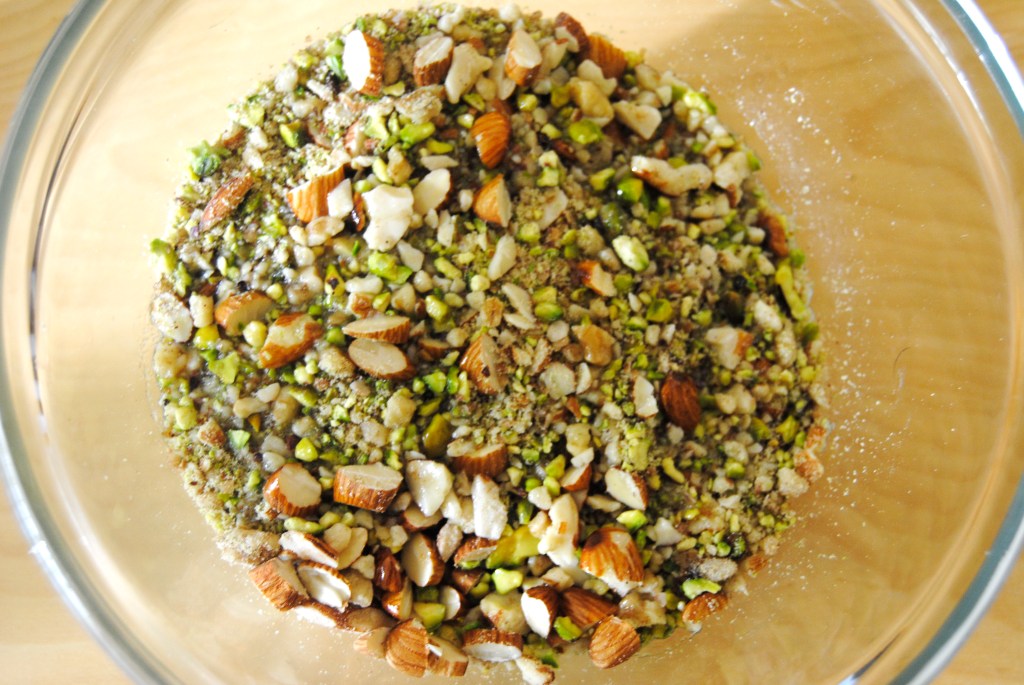 Combine your nuts and pour 4 tblsp of the clarified butter over them. Combine well.