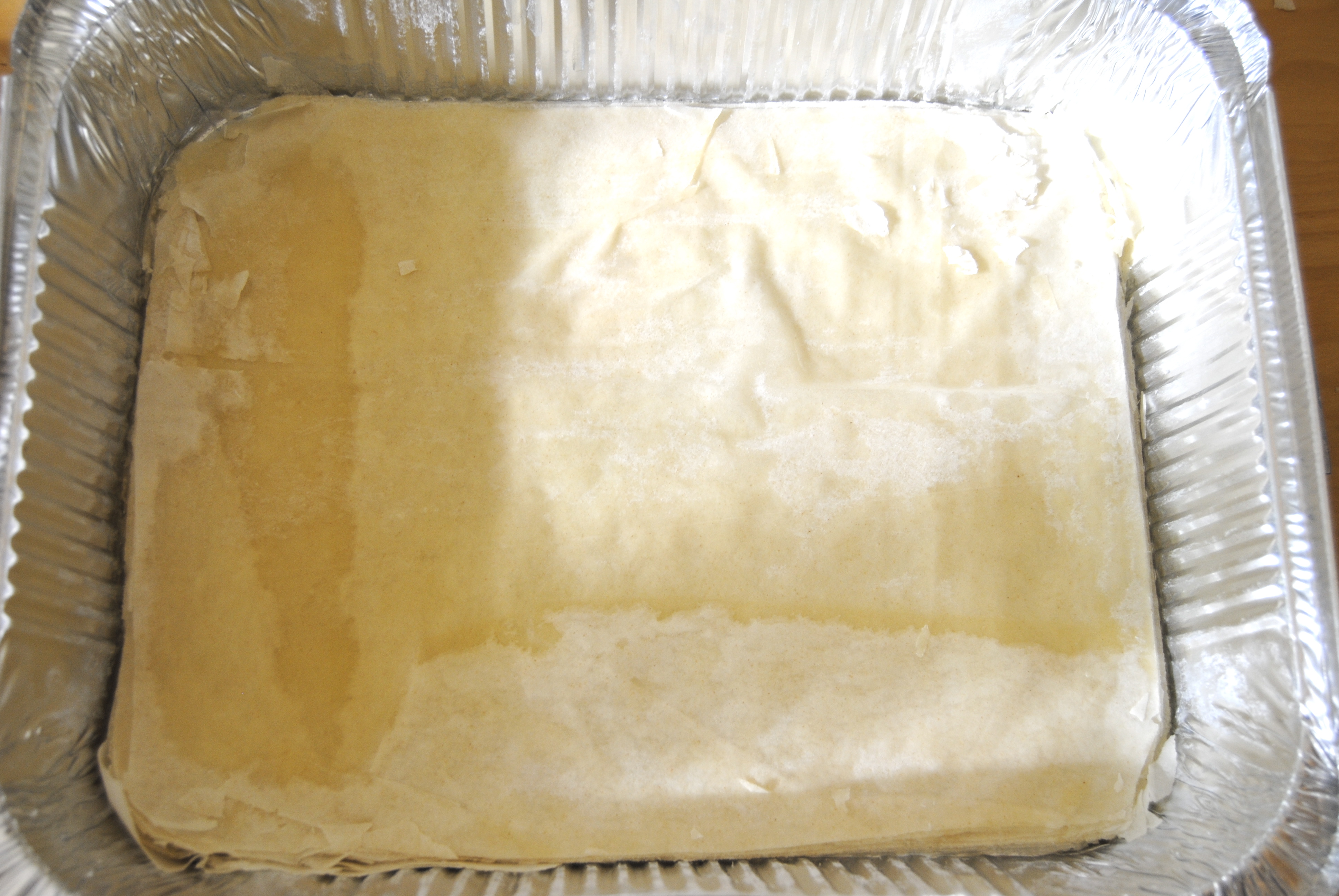 Butter the bottom of a 9×13 inch baking tray well with your baster/brush. Roll out your phyllo dough carefully and place it flat. If some of it is torn, don’t worry, okay? Make sure you have 22 sheets. If you forgot that detail at the store, just make sure you have an even ratio on the bottom and top and a multiple of two sheets in the middle. If numbers stress you out, just try and make it work. If your sheets are big, cut them in half (or so they fit easily into your tray without too much “muffin top” happening). You want about 1/4 inch hanging over, which we will use as filler later on.