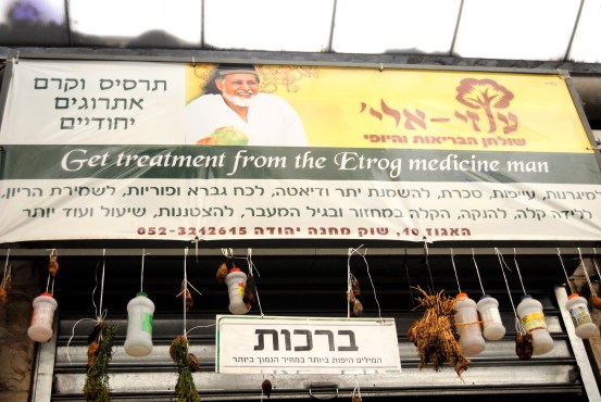 I spent all morning today in one of my favorite places in the shuk, a small, ten-year-old shop filled with customers searching to heal ailments such as hypertension, migraines, sore throats and urinary problems. Once I heard someone ask how to heal her joint pain. His prescription: don’t be so judgmental, and then he also squirted two droplets of his famous ginger-camphor-mint-etrog serum into her palm and had her rub her aches with it. When you walk into his shop with a head cold though, he’ll quickly grab your finger, squirt some onto the tip, and tell you to stick it up your nose and inhale deeply. It usually makes me cry, but man, it seriously works. He calls himself the “Etrog Medicine Man” because etrog is a main ingredient in many of his recipes, and he also makes soaps, hand creams and sprays that offer dozens of medicinal etrog benefits. Etrog is a citrus fruit not quite orange and not quite lemon (though much closer to lemon). It can be as large as 6 inches in length, it has a bumpy exterior and is mainly used on the Jewish holiday Sukkot.