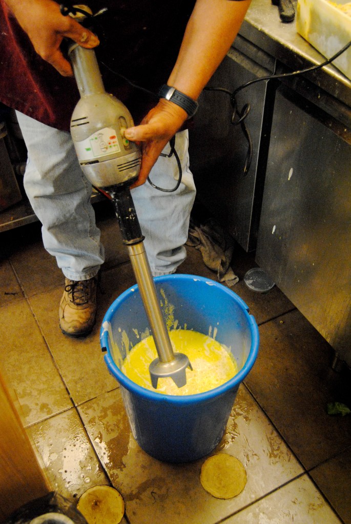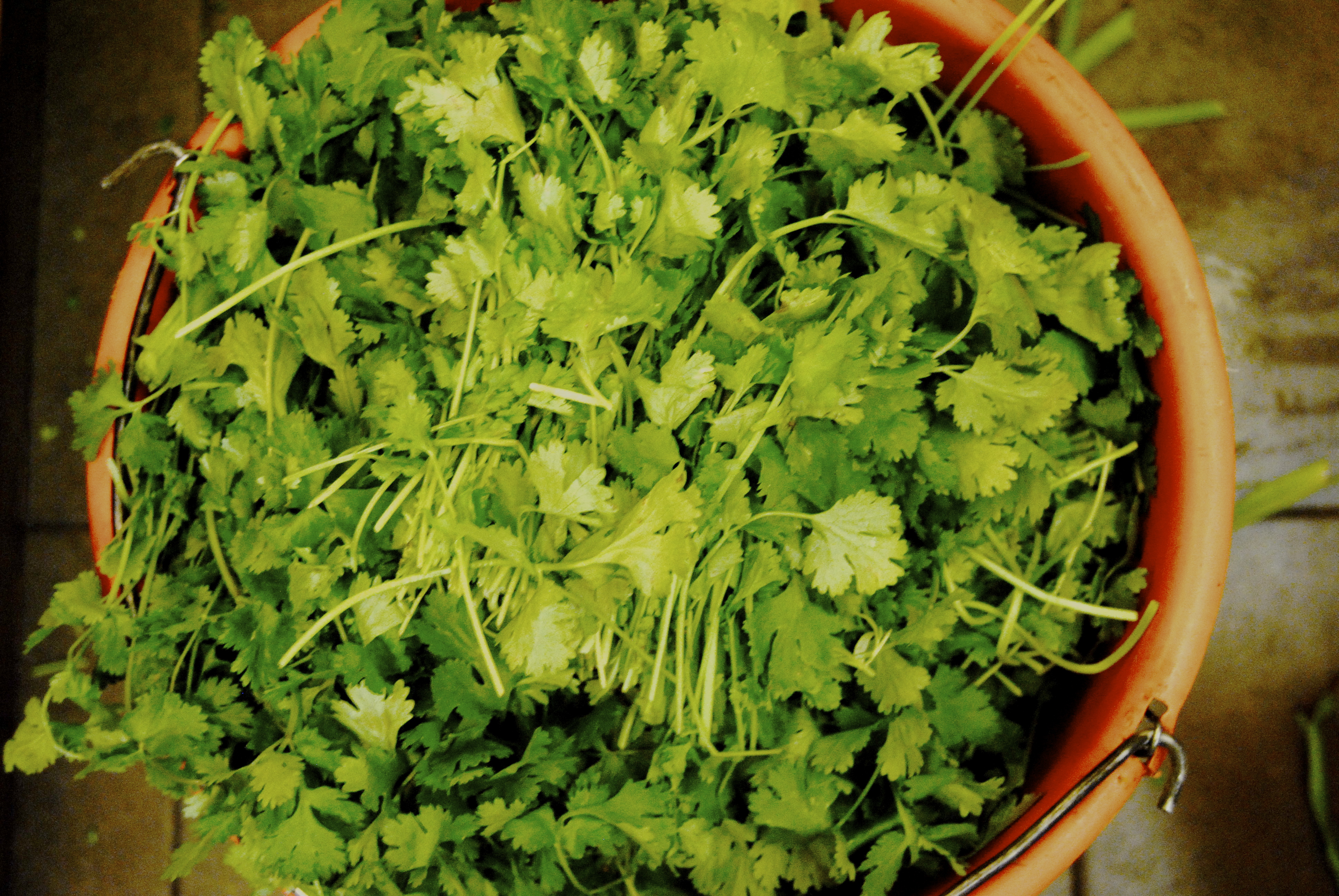 green onion/garlic plant and cilantro go into the blender with the strained garlic juice, then they are strained in the sieve with the garlic (they blend together here) and the juice retained