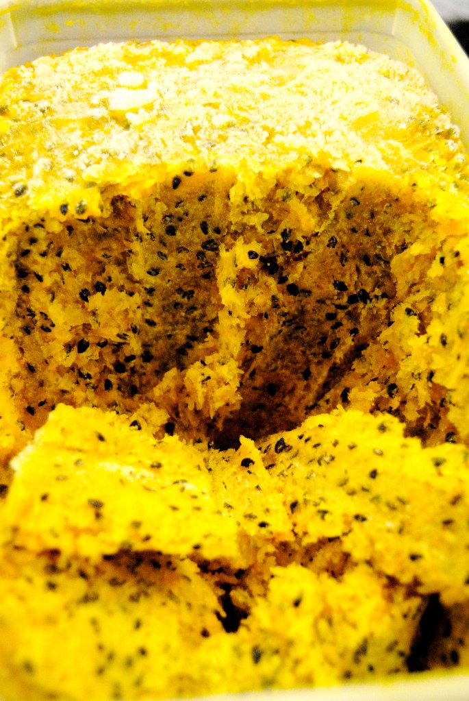 he takes fresh passionfruit and freezes it. then he places it in a machine that separates the seeds from the juice. then he puts the juice into a blender.