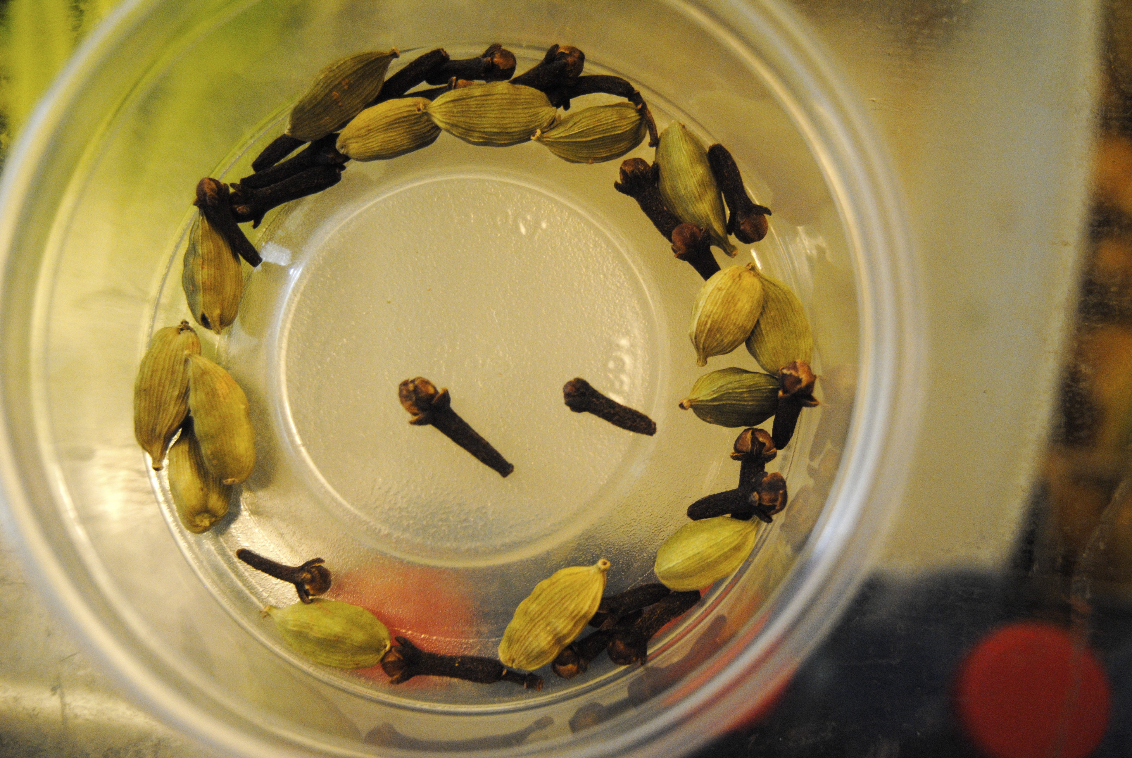 whisk the blended greens around till they form a thicker consistency. the mixture (which is now the greens with the garlic) goes back into the blender and kosher salt, a drizzle of olive oil, cloves and cardamon pods are added and blended.