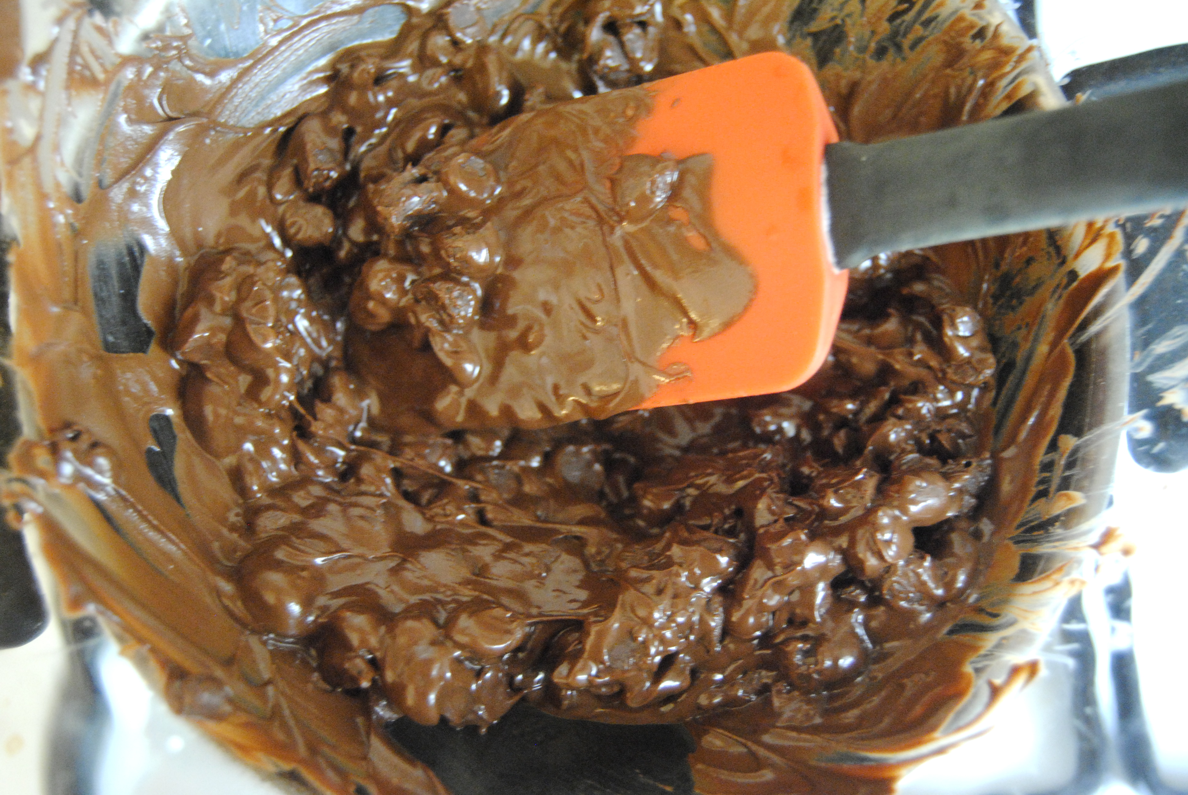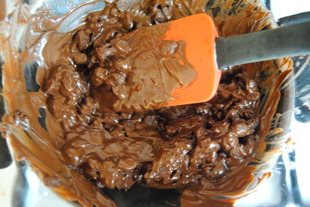 Let the cake cool for about 15 minutes, and while it’s cooling, melt the chocolate chips. If you have a microwave, then I’m jealous. If you don’t, create a double-boiler by boiling water in a small pot and placing a glass bowl on top filled with the chocolate chips. The heat from the water will melt the chocolate without burning it, and you just need to keep stirring every minute or so. Make sure the bowl that the chocolate will be in is at least an inch above the water.