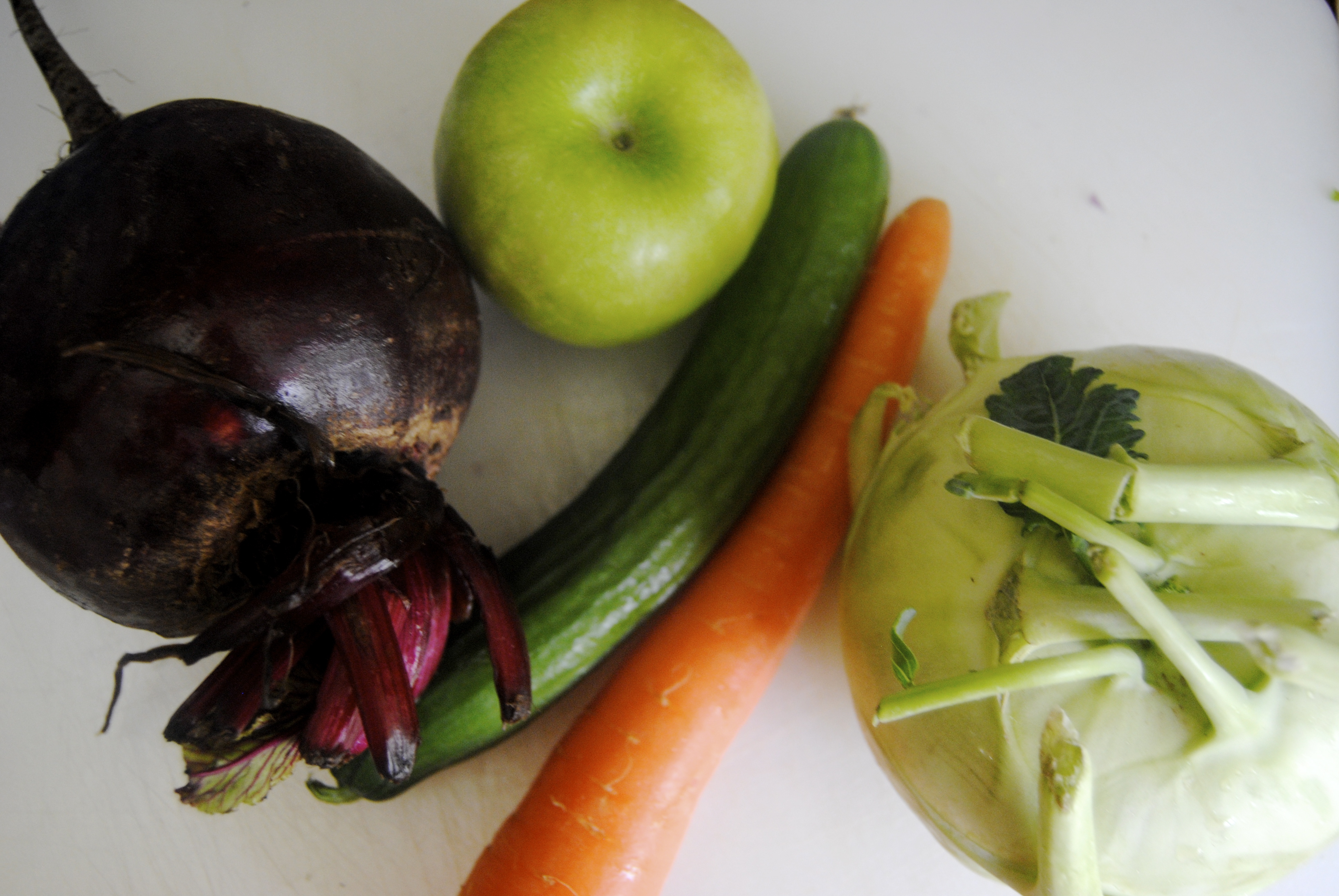 If you’re not really a visual learner: take a carrot and cut it straight on two sides. Then place it on one side for a flat surface and begin cutting thin flaps from the top down. Stack them into a pile or cut in half and make two piles. Finely slice each piece lengthwise. Do the same thing to the beet, apple and kohlrabi.