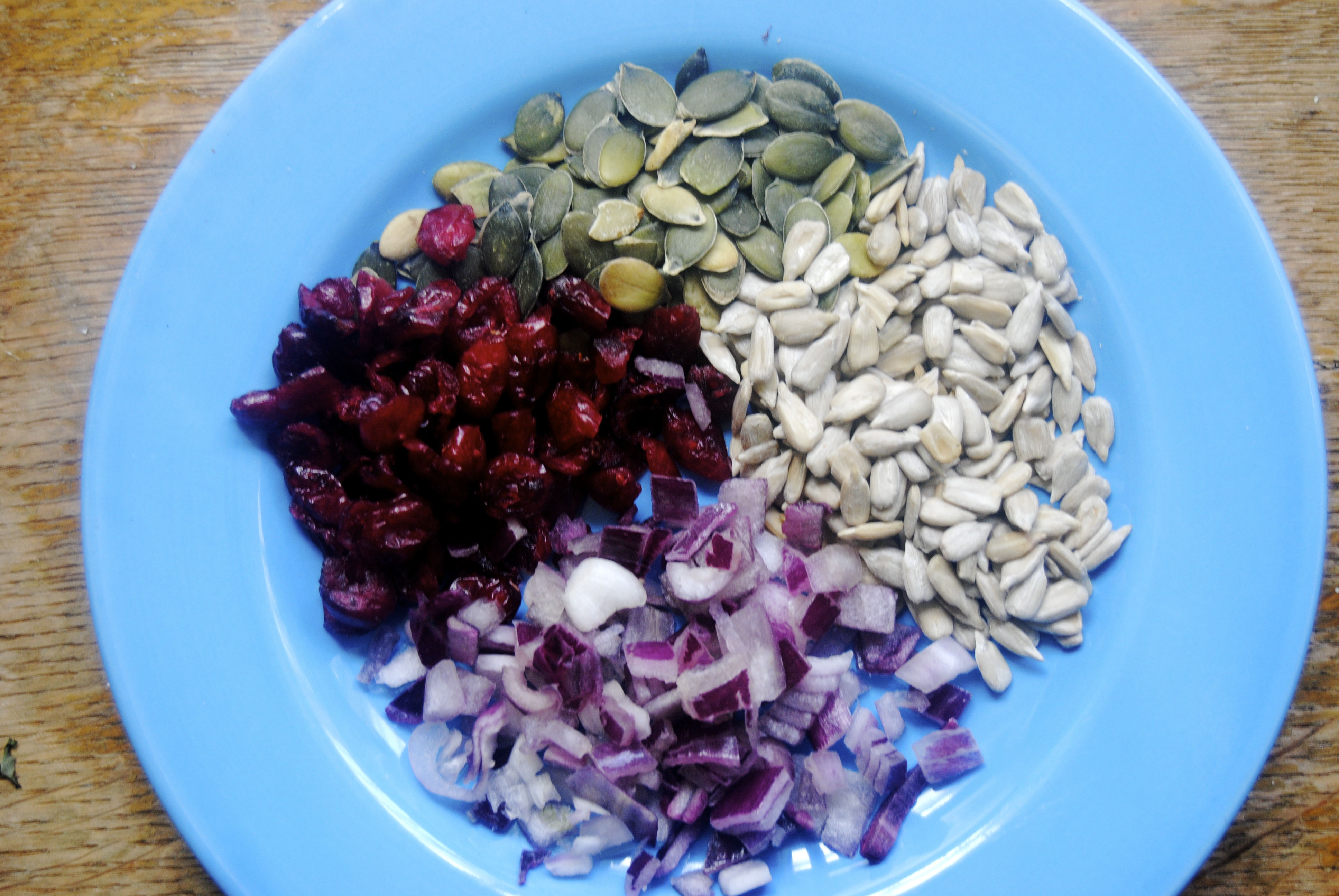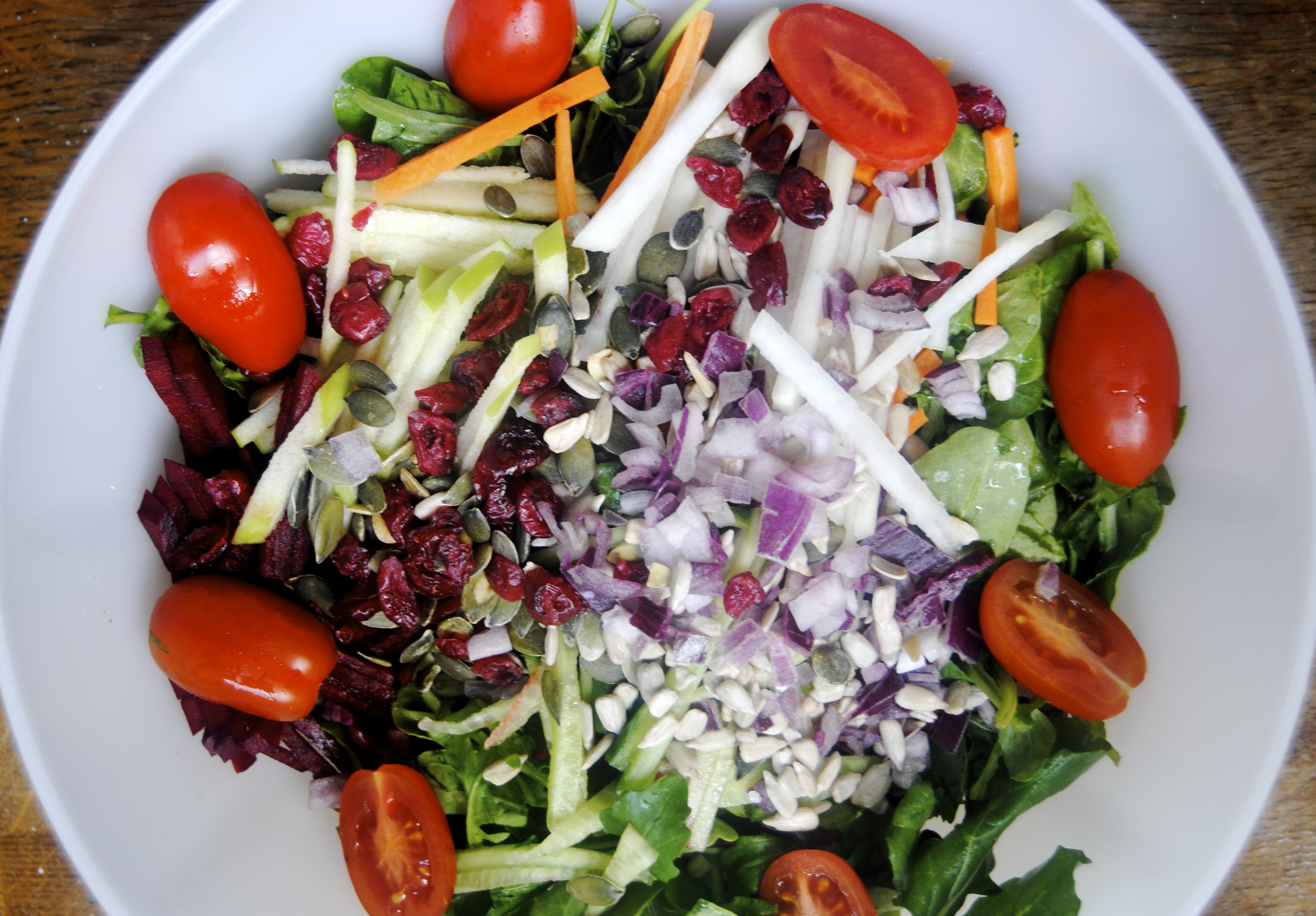 This salad comes from Cafe Mizrahi in the shuk and is known as the “Ya-Ya Salad.” I haven’t adapted anything in it because it’s simply perfect the way it is, and I can’t wait to share it with you. After I ordered it one day, I bought all the ingredients, went home and tried my hand at recreating it. It’s a healthy blend of crunchy beet and kohlrabi, combined with sweet dried cranberries, tomato and apple, and made slightly nutty by the pumpkin and sunflower seeds. Each bite comes together with the creaminess from the yogurt & tehina dressing. I hope you enjoy this small taste of Jerusalem!