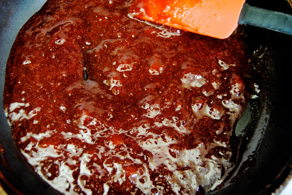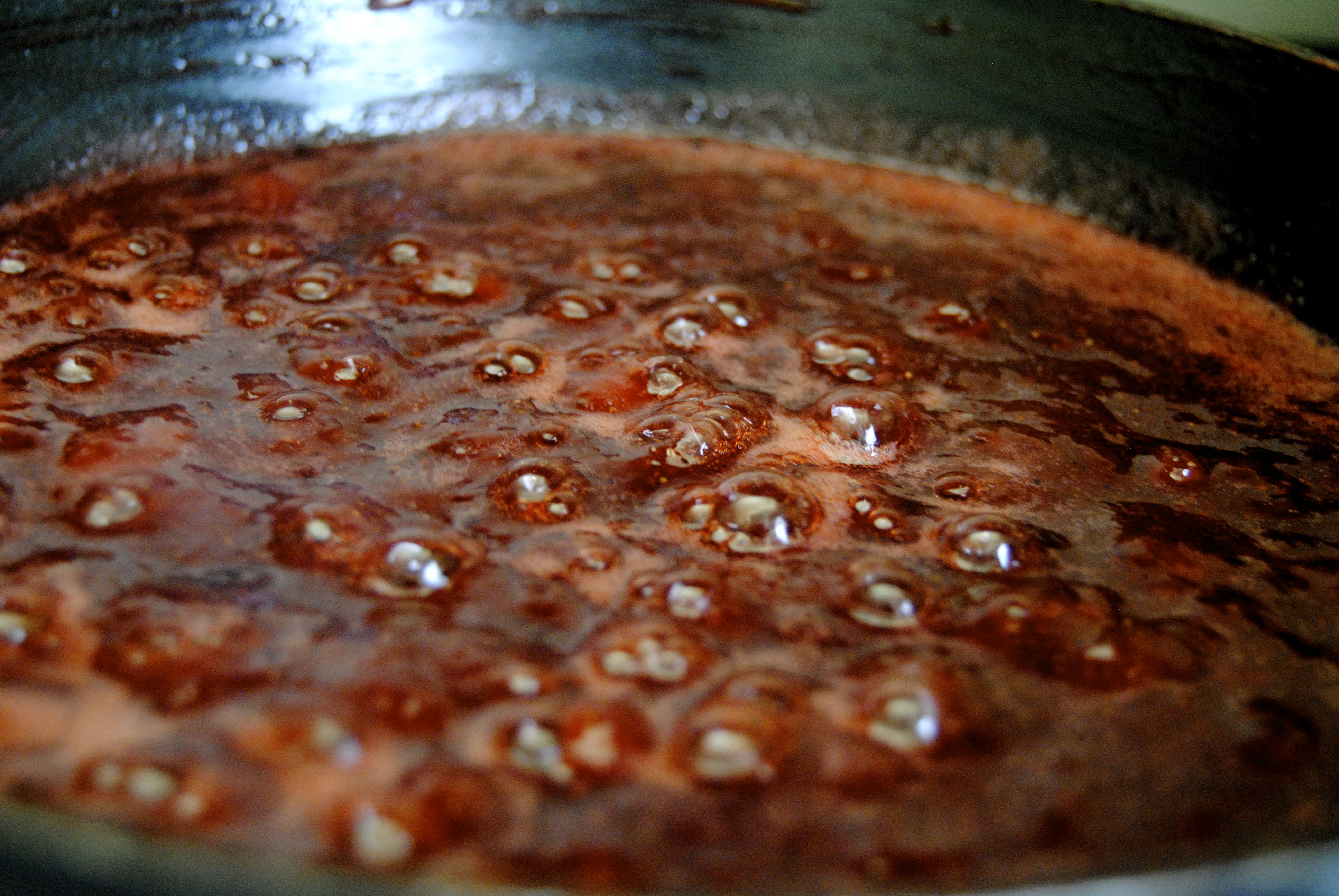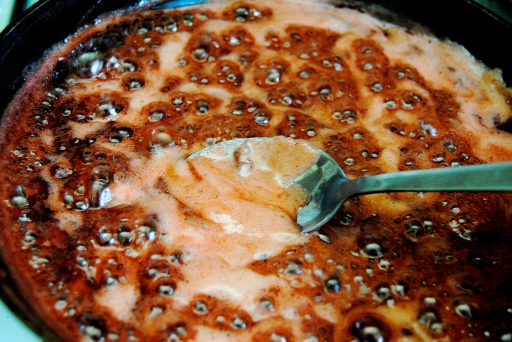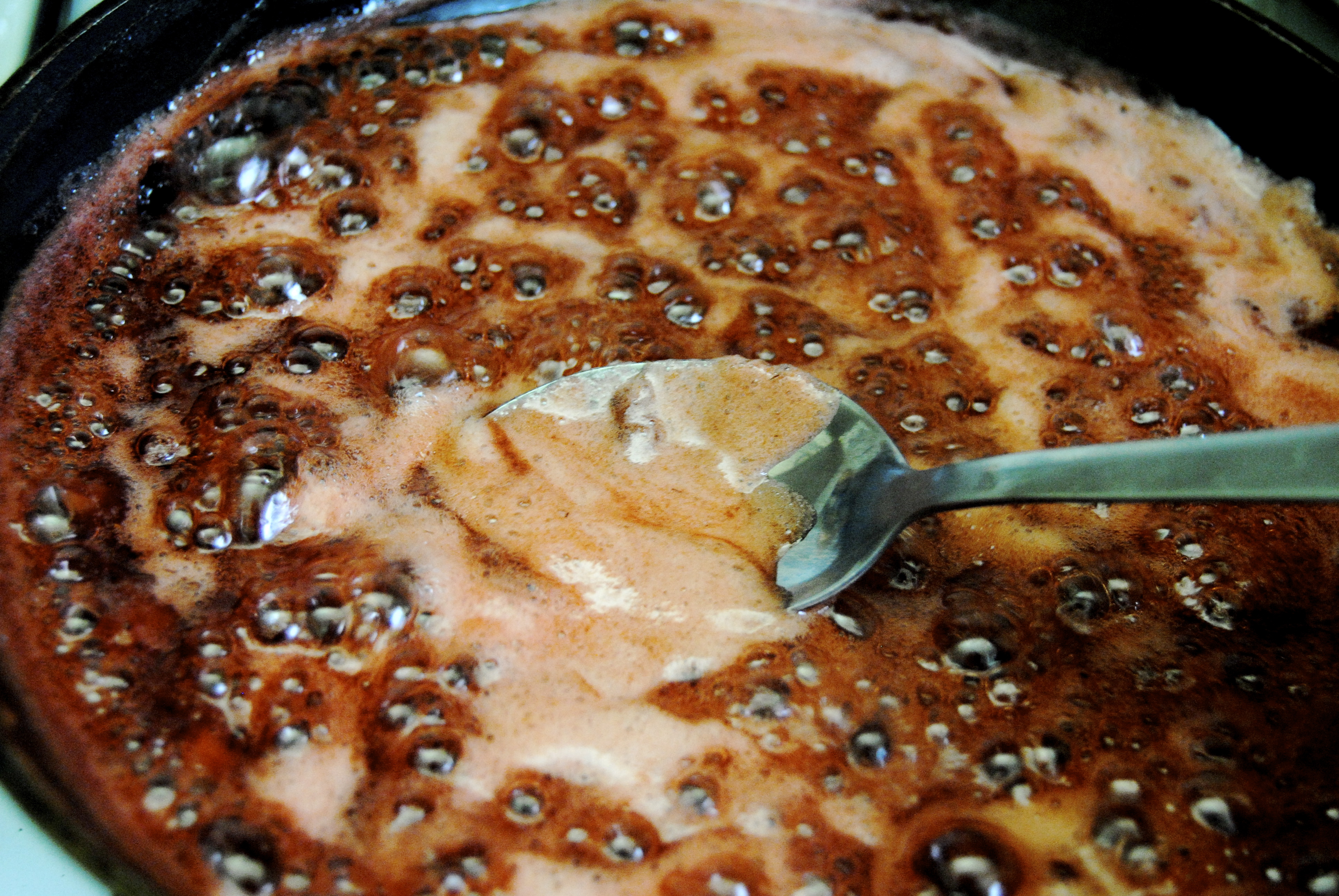 After five minutes or so, the mixture should begin to thicken a little and foam will begin to form at the top. Spoon out the foam as best you can, still continuously stirring. Don’t panic if you can’t remove all the foam out.