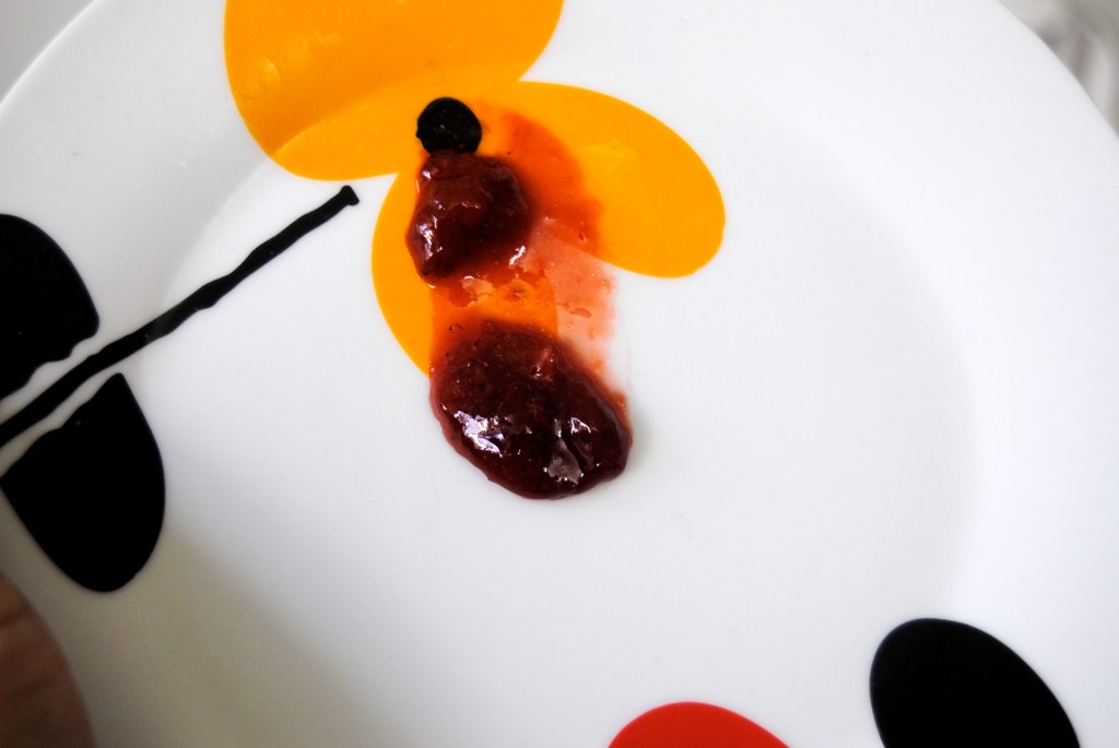 After about eight minutes or when the jam begins to look like it has thickened, remove the plate from the freezer and spoon some of the jam onto the plate. If it is runny and separates like this, the jam is not ready yet.