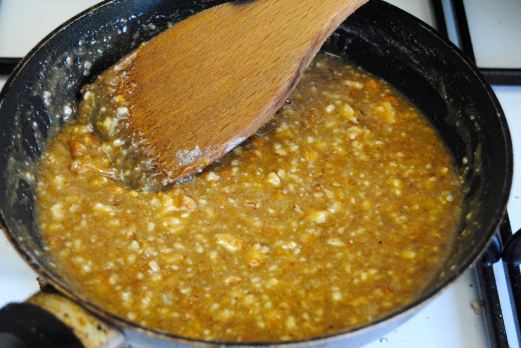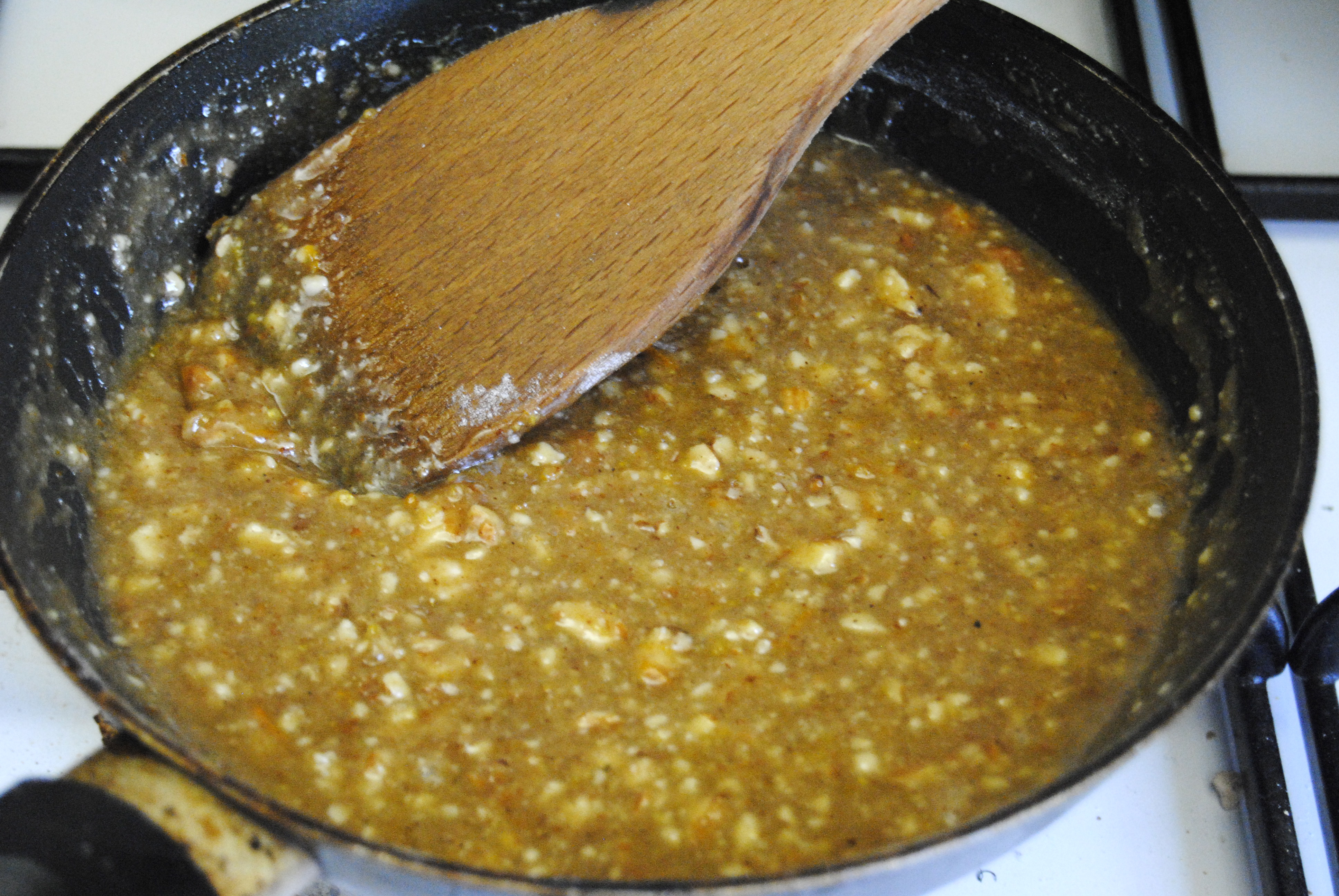 Grab a bowl and mix the flour, almonds, cinnamon and orange zest together, slowly adding them to the wet mixture and making sure everything is incorporated well. Let sit for about 20 minutes or until the mixture is cool enough to be handled, even though you won’t be handling it. If the mixture is stiff when you return to it, warm it up over a low flame for a minute or two.