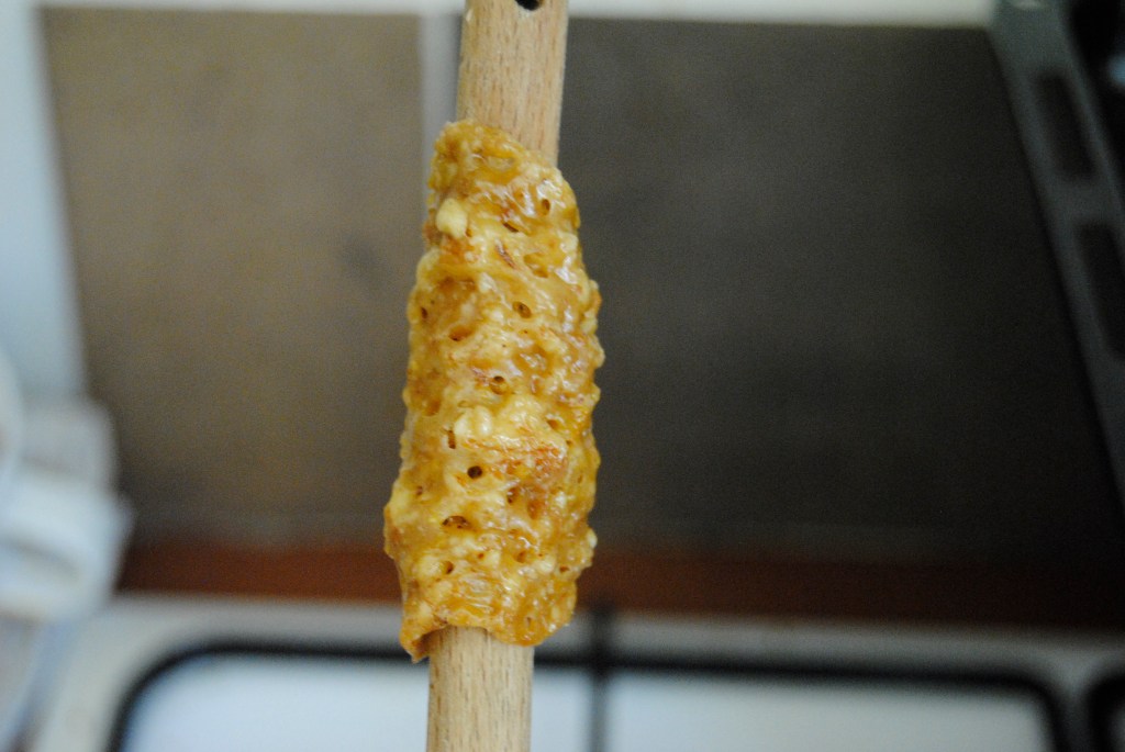 Drop teaspoon-sized balls onto your parchment paper, leaving about three inches space between each of the cookies because they will spread a lot. Leave them to cook for 6-8 minutes. If you want them more like toffee brittle leave them in on the longer end. Once the centers are bubbling and they are a goldeny-brown color, remove them from the oven, and immediately remove the parchment paper from the tray and set them to cool on the counter. After about three-five more minutes, you’ll be able to remove the cookies from the parchment paper without a problem. Any sooner and they’ll still be soft and likely tear. Once you’re able to remove them from the parchment, you can wrap however many you want around the stick of a wooden spoon and create a flute. You can also fold them to create a bowl for ice cream, or you can teaspoon chocolate onto the flat side of a cookie and sandwich it with another. Place them in the fridge for about 15 minutes to get the chocolate hard.