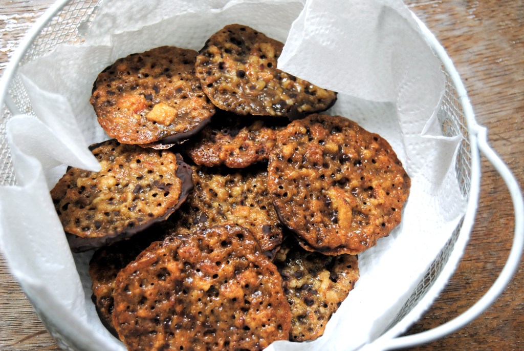 Nevertheless, I bring you THE BEST knock-off lacey cookies that you can make with minimal ingredients, impress everyone at the party and gain a few pounds in the process! Hooray…? They are perfectly chewy in the middle, crispy on the ends, toffee-scented with a hint of orange. And if you aren’t salivating yet, chocolate can be sandwiched between two layers, dipped around the edges, drizzled across or they can simply be rolled into flutes and accompany your morning, afternoon and late afternoon coffees.
