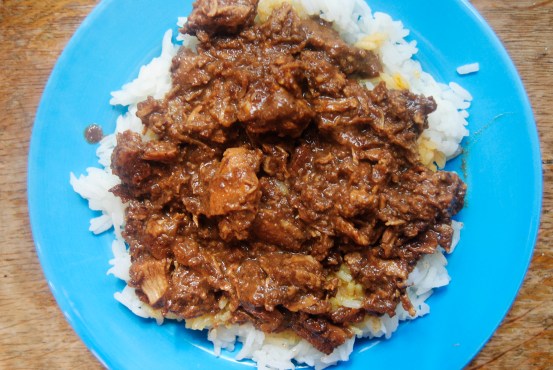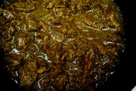 Cover the stew and leave the lid slightly ajar. Let this simmer on low for about 30-40 more minutes, checking back every so often to make sure nothing is burning. When the chicken softens, break it into small, almost shredded pieces with your spatula. This can cook on low heat until your guests arrive, as long as you are checking it and adding water small amounts of water at this point when it thickens too much. Or, turn it off, leave covered and warm up slightly when your guests arrive. Try as best you can not to add too much water though. As listed, about 2 cups only.