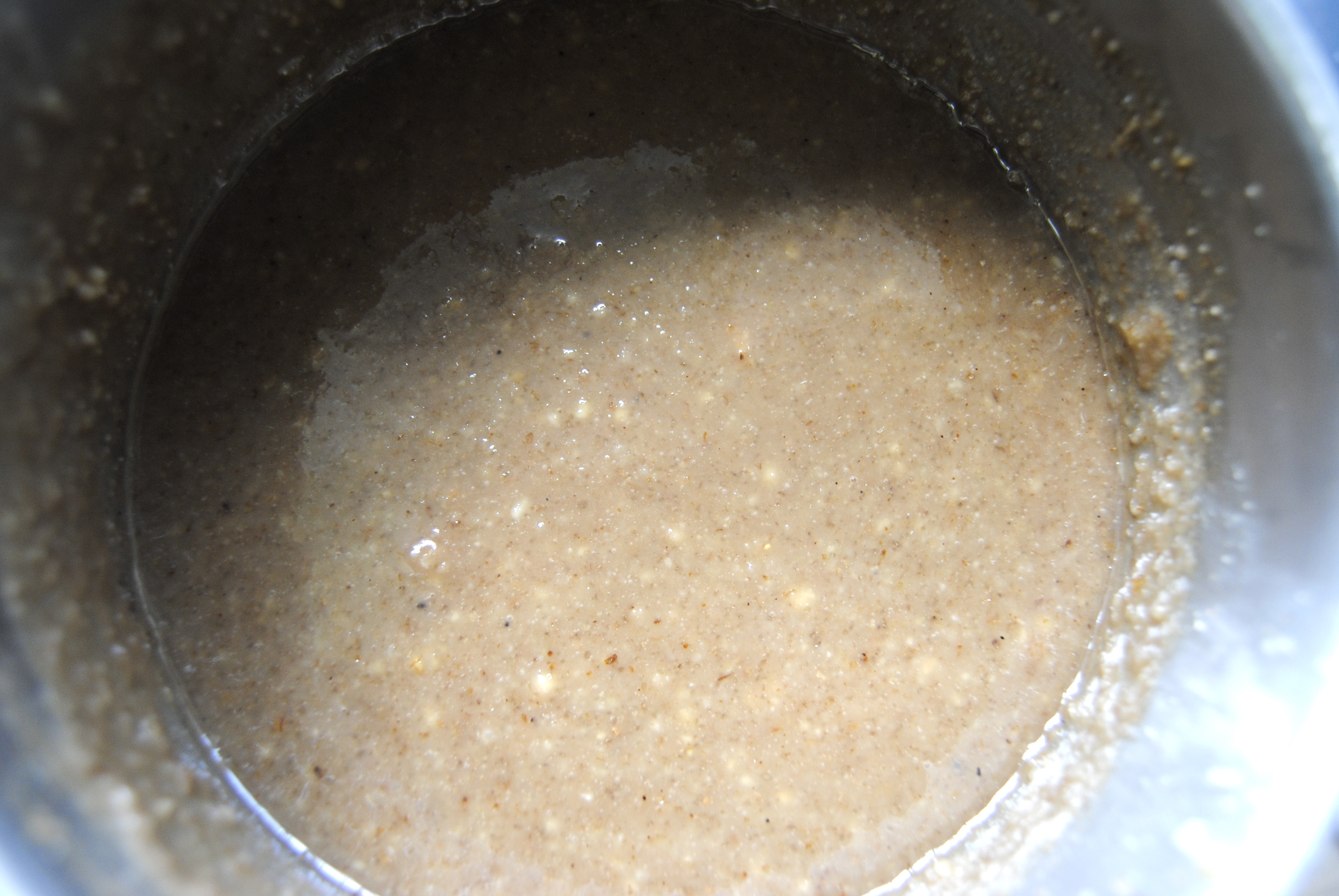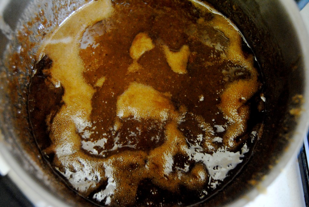 Once the walnut oil has emerged, add a about 1/4 cup water and give the mixture a stir. Don’t be frightened when it turns into a thin yellowish liquid. It will thicken back up and darken in minutes. Also, this is a good moment to stick your finger in and taste it. If it’s too sour, add a little more sugar, and if it’s too sweet, then add a little more pomegranate syrup.