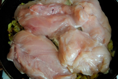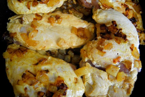 While the sauce is cooking though, heat up oil (a couple tablespoons) over medium heat in a large pan or pot for a couple of minutes. Add the onions and saute until it becomes dark (you don’t want them to show through the stew) and then add the turmeric. Stir a few times and spread the turmeric around. Then add your chicken pieces. Add a little salt and pepper to season, but if you’re using kosher meat, don’t add too much salt since kosher meat is already salted.