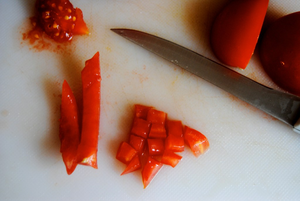 Soak the bulgur in water so that the water sits two inches above the bulgur. It will take about 30 minutes until it’s soft, not crunchy at all. Quart the tomato.