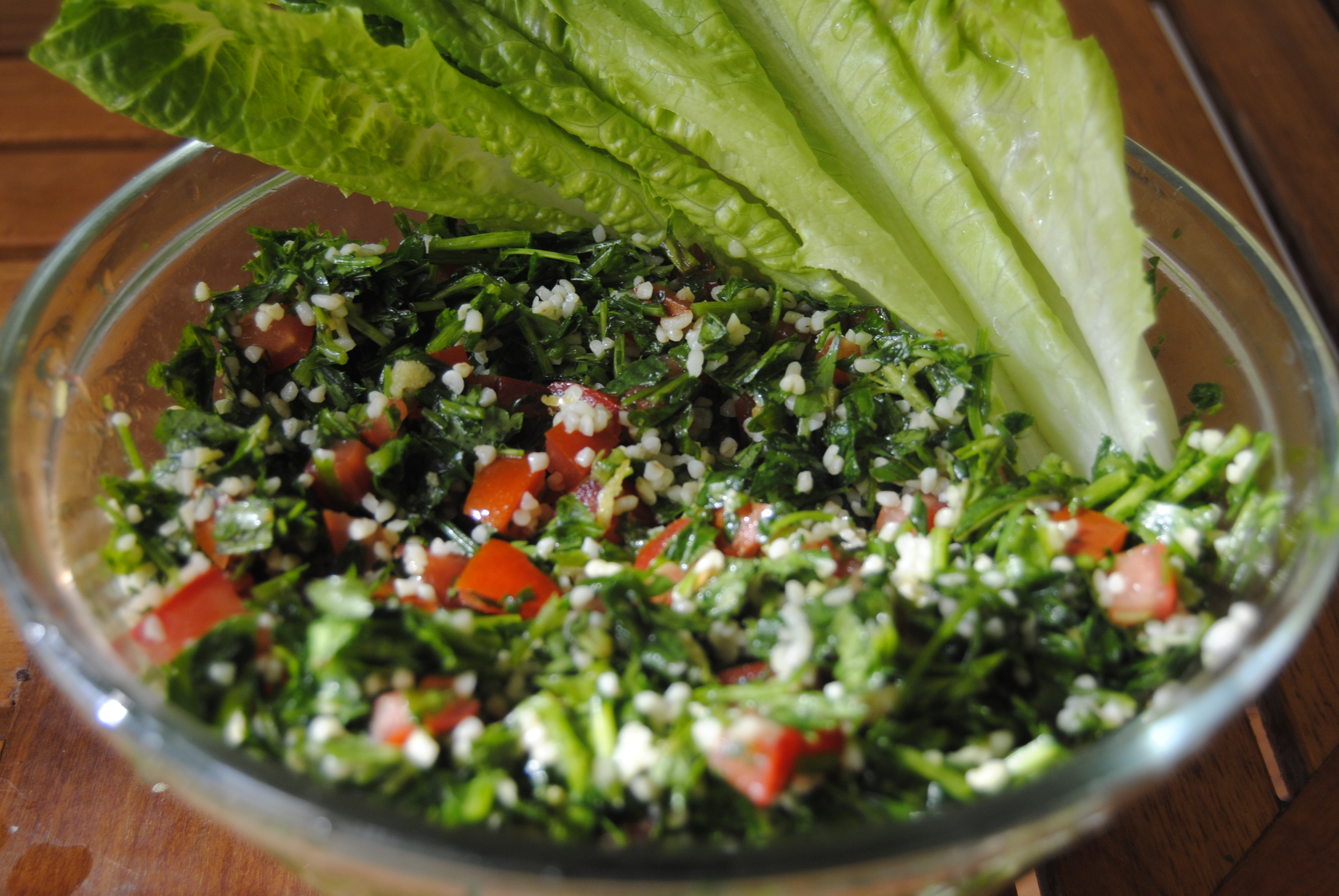 Finely, finely, finely dice your herbs and combine with the lemon juice, olive oil, salt and bulgar. Toss several times. Serve over a bed of cabbage or lettuce or encircled by cabbage or lettuce leaves. Let sit on counter tip for 15- 20 minutes before serving. Enjoy!