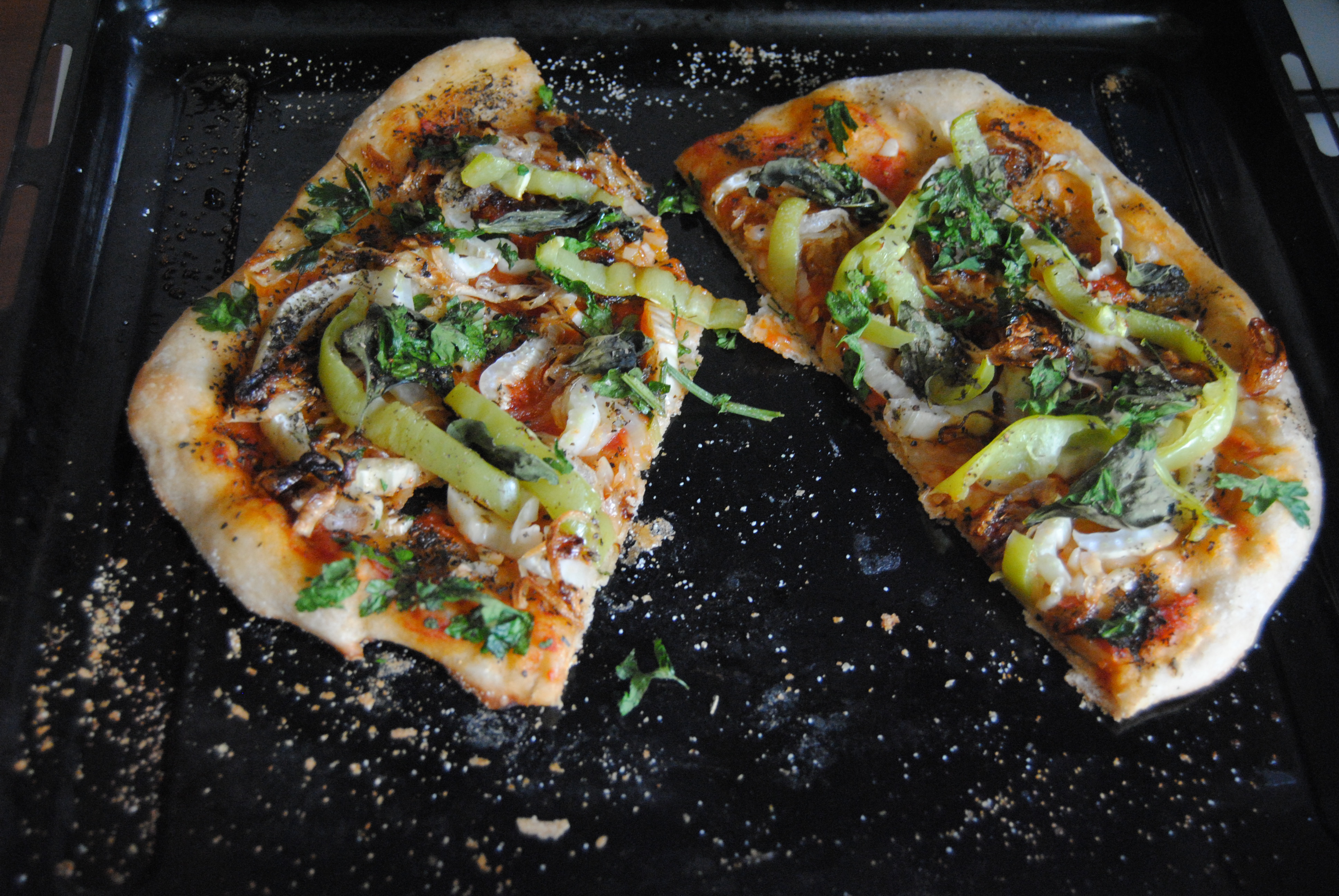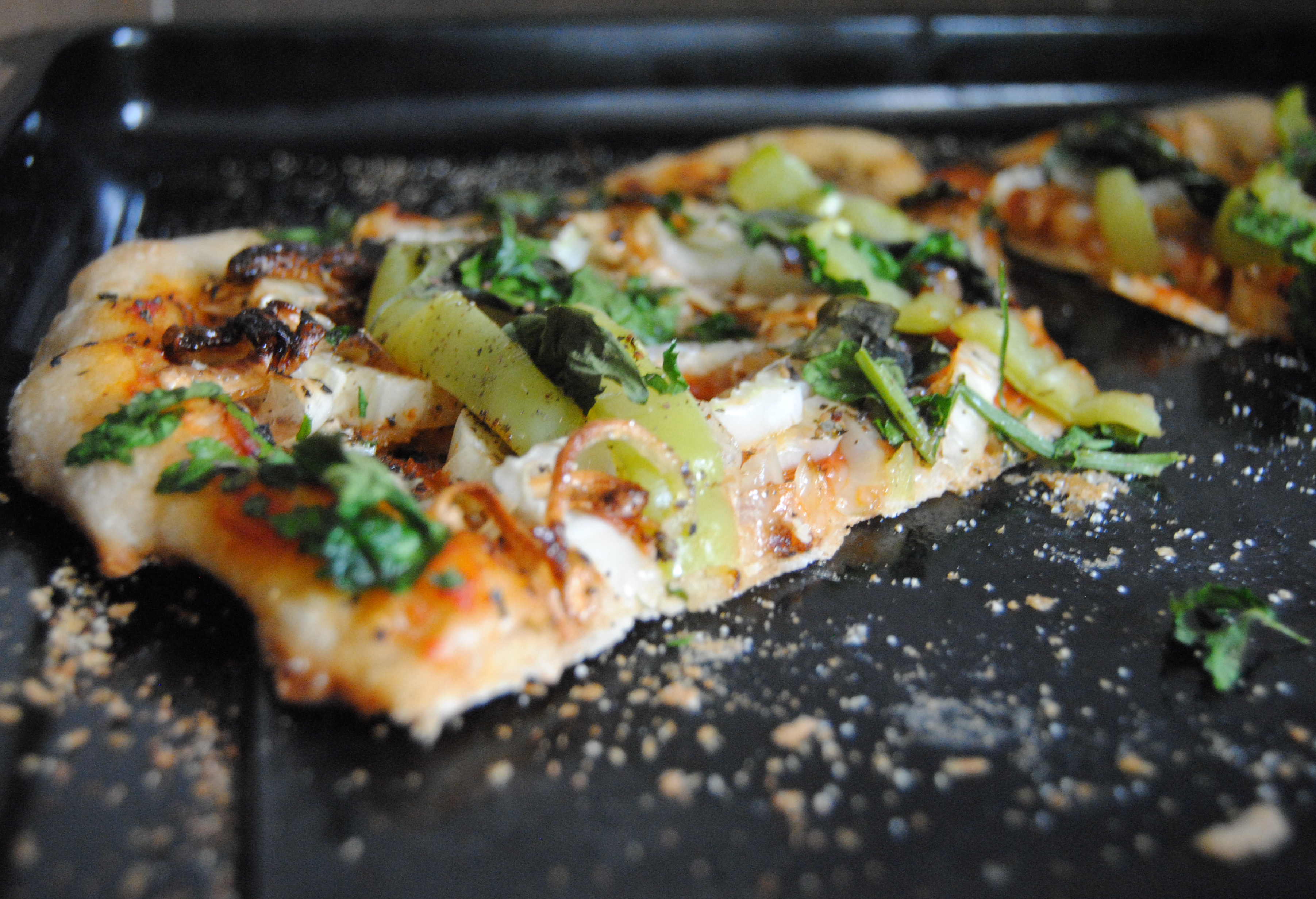 Spread 2 tblsp of sauce all over the pizza, leaving a 1″ margin for the crust. Again, try not to go overboard on the center of your pizza or it will become soggy. Add your carmelized onion, fennel, pepper and herbs. Place back into the oven on a middle rack and let cook for another 6-8 minutes. Enjoy!