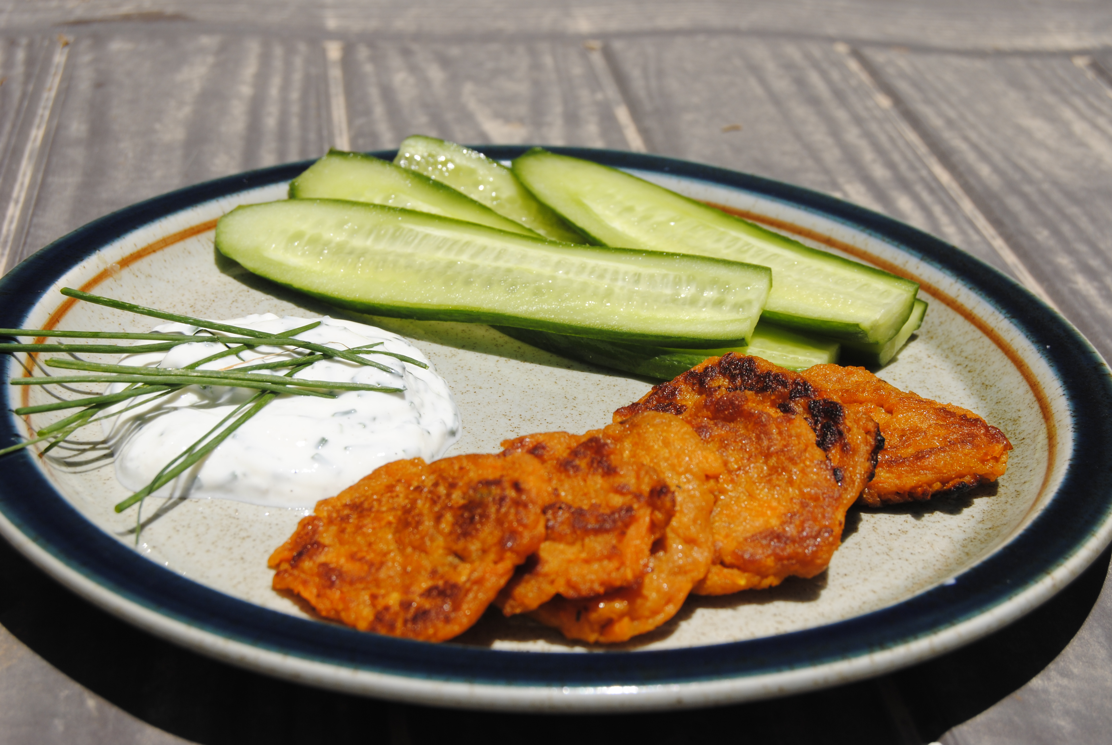 Mash up all the ingredients together until they become a soft, combined mixture. Let rest for 30 minutes. Transfer into a ziplock bag and make a small cut at the tip (or a piping bag–doing this with a spoon is too dangerous over the oil). Put a thin layer of oil in a frying pan over medium heat. Each time you add new sweet potato mixture you’ll need to add more oil. But don’t use too much. Squirt tablespoon sized balls onto a frying pan and flatten into a patty with the back side of a spoon. Fry for about 6 or 7 minutes or until the sides become golden. Transfer to a piece of paper towel to drain out some of the oil and when you’re finished, cover them all with a paper towel and press down to absorb any additional oil. Place in the refrigerator until serving. BUT before serving, warm them up at a very low temperature in your oven. They heat up very well, so you can make these in advance!