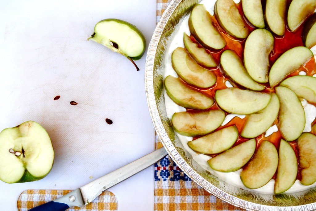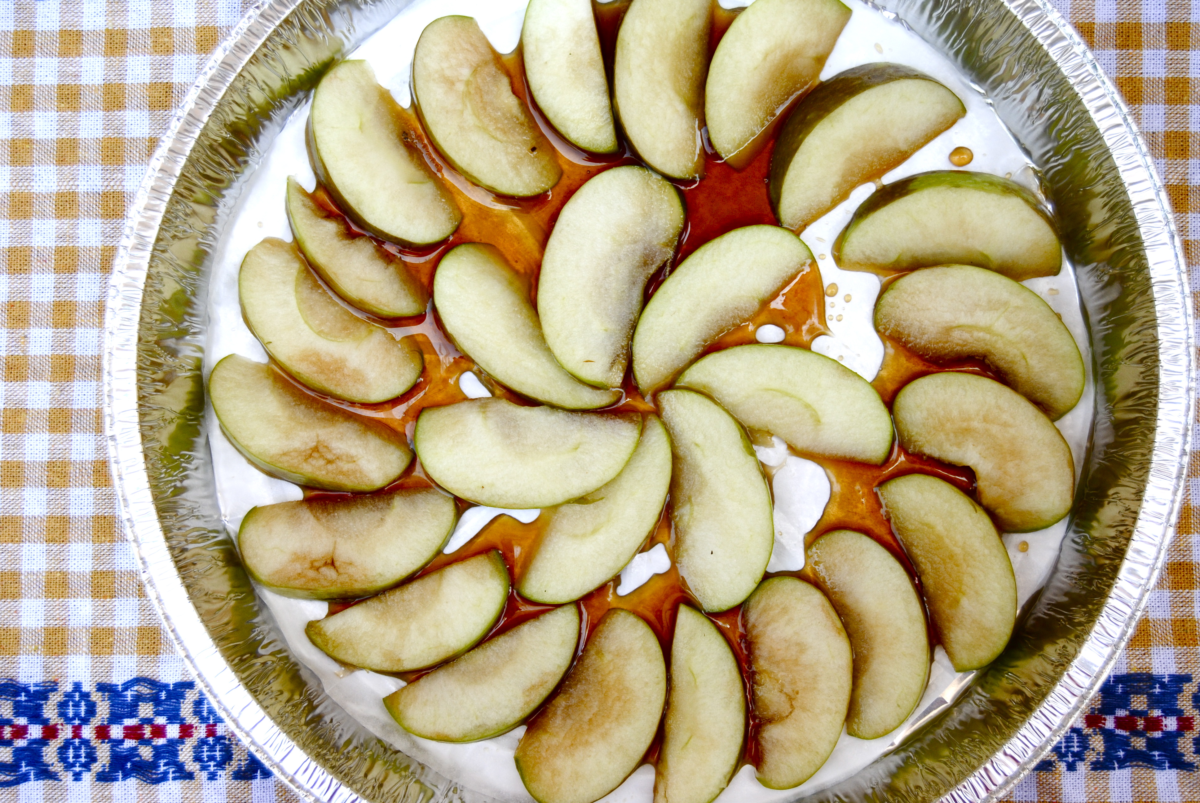 In a bowl, combine the flour, baking powder and salt. In another bowl, cream together the butter (or butter & oil if you have divided the amount), remaining honey and sugar. Blend in the eggs. Add the dry ingredients until the batter is smooth and pour the batter over the apples, trying to pour it all over, evenly, so you don’t have to spread it too much and risk messing up your beautifully arranged fruit.