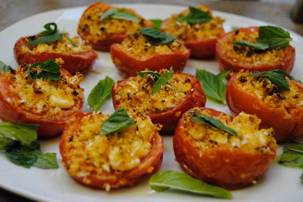 Place the marinated tomato halves, open-side-up, on a parchment paper-lined baking sheet. Fill each tomato half with the bread crumb & cheese filling. Drizzle about 1 tblsp of olive oil over the tomatoes. Bake for 20 to 25 minutes until the tomatoes have slightly softened and the underside of the tomatoes are brown. If you notice that the tops of the tomatoes are starting to look very brown (like the bread crumbs are burning), bring the tray out slightly and just move a little bit of the mixture around. No worries. Top with the chopped mint (I would do more than I showed in this picture), and serve warm. Enjoy!