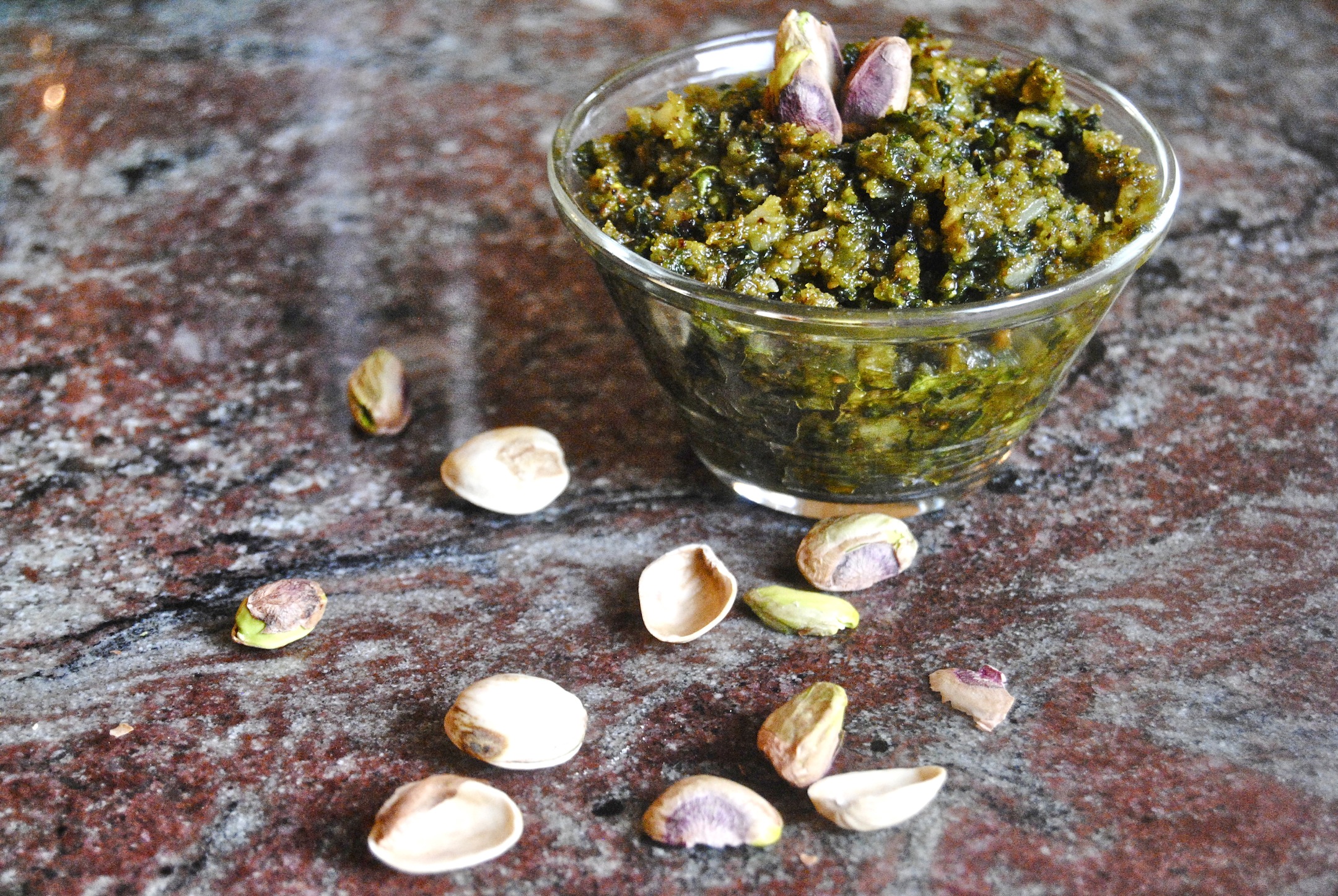Place your pistachios in a grinder (food processor, coffee grinder, whatever you have available to you) until they become a powder. If you don’t have one, and don’t mind a nuttier pesto, you could probably just put them in a plastic bag and smash it with a pan a few times. Chop your basil finely and add it to the ground pistachios. Add the garlic and Parmesan cheese and give the mix a few stirs. Add the olive oil and stir until there are no visible dry globs and until it reaches a spreadable consistency. Taste the mixture and if it needs salt, add accordingly—some Parmesan cheeses are incredibly salty. Personally, I like it best after it has sat in the fridge overnight, but you can eat it right away. Enjoy!