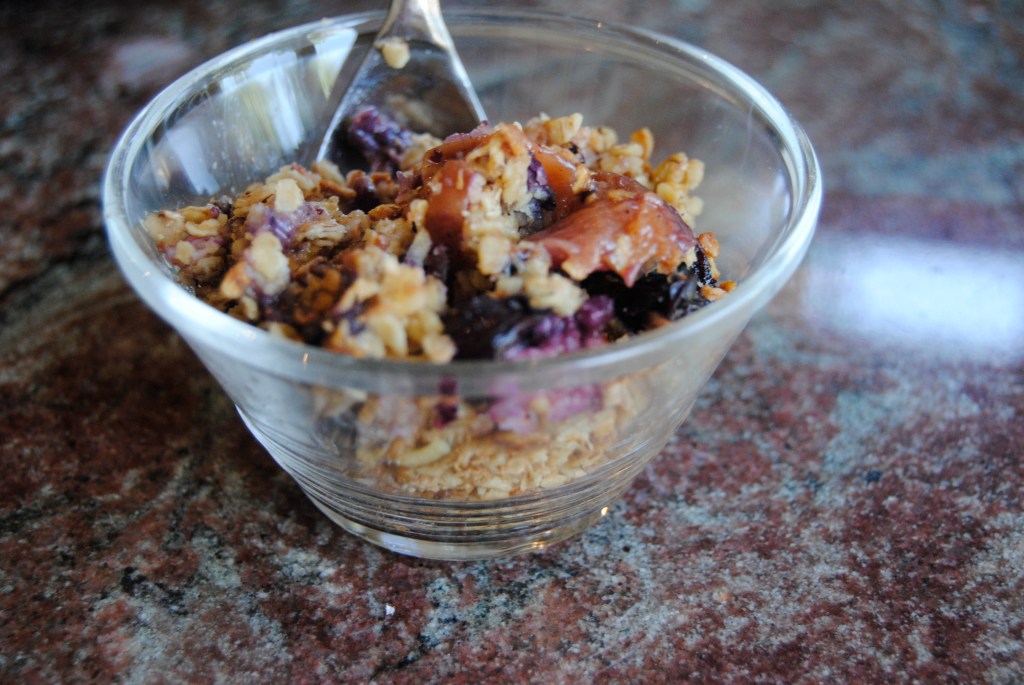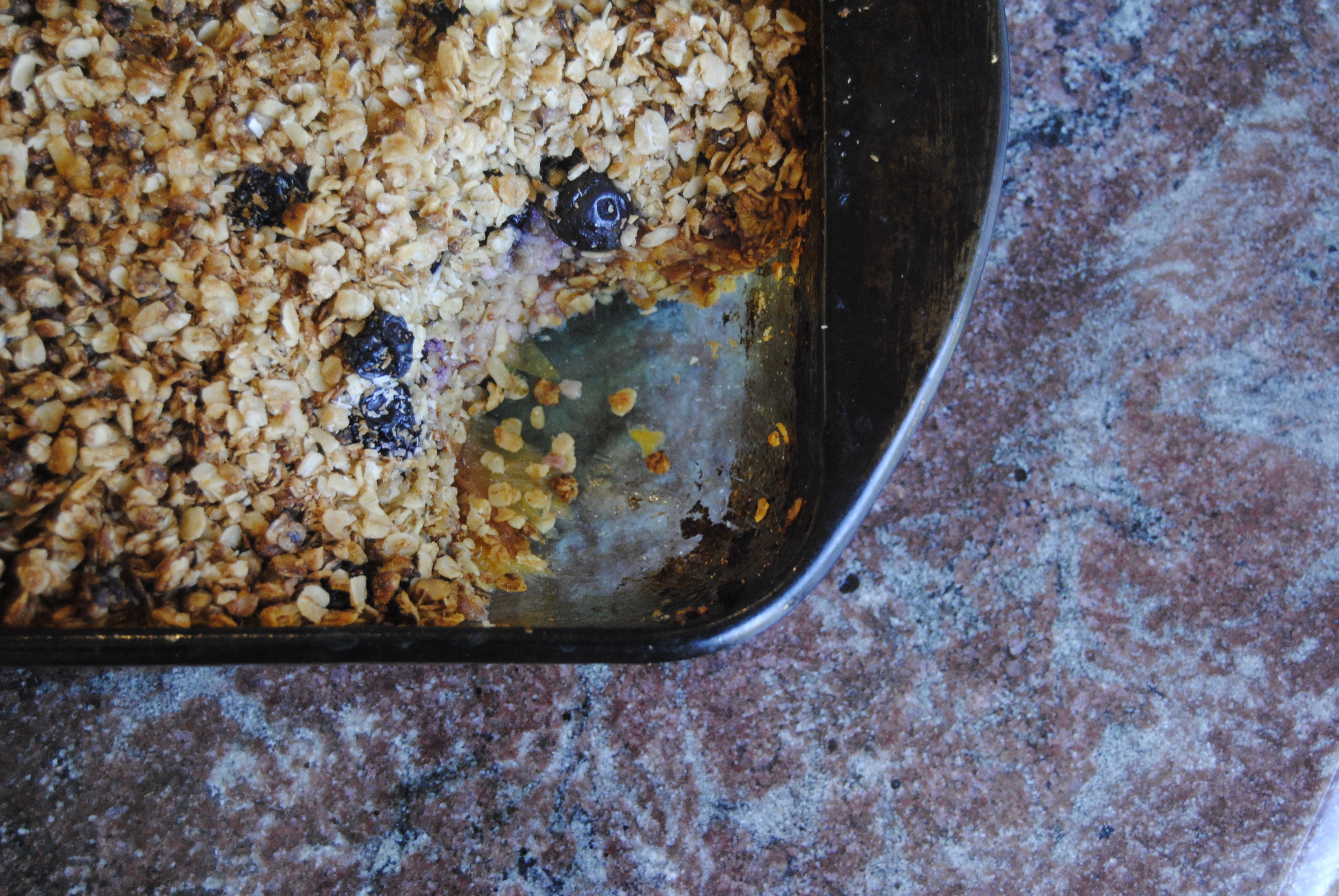 In a bowl combine the flour, oats (if you’re not using your own granola) blueberries and a pinch of salt, as well as the almond flakes and/or coconut if you are using those. Add the butter (or applesauce) and honey mixture to the dry ingredients and combine until clumps form. Spread this mixture evenly over the peaches and place in the oven for 45-50 minutes.