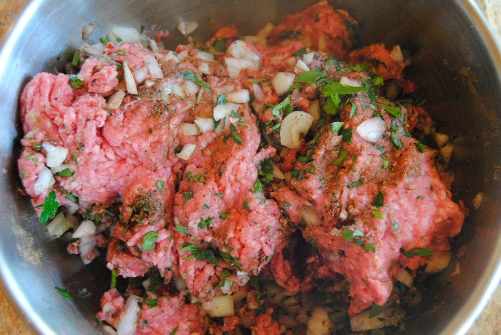 With your hands, combine the meat, parsley, onion, egg and baharat spice. Knead the mixture for about ten minutes. You may notice that the meat will change slightly in color and the consistency will become very sticky. Cover and place in the fridge for at least 30 minutes to let all the flavors combine. While that’s in the fridge, bring all the ingredients for your tomato sauce to a boil, reduce to low and cover for about 20 minutes.