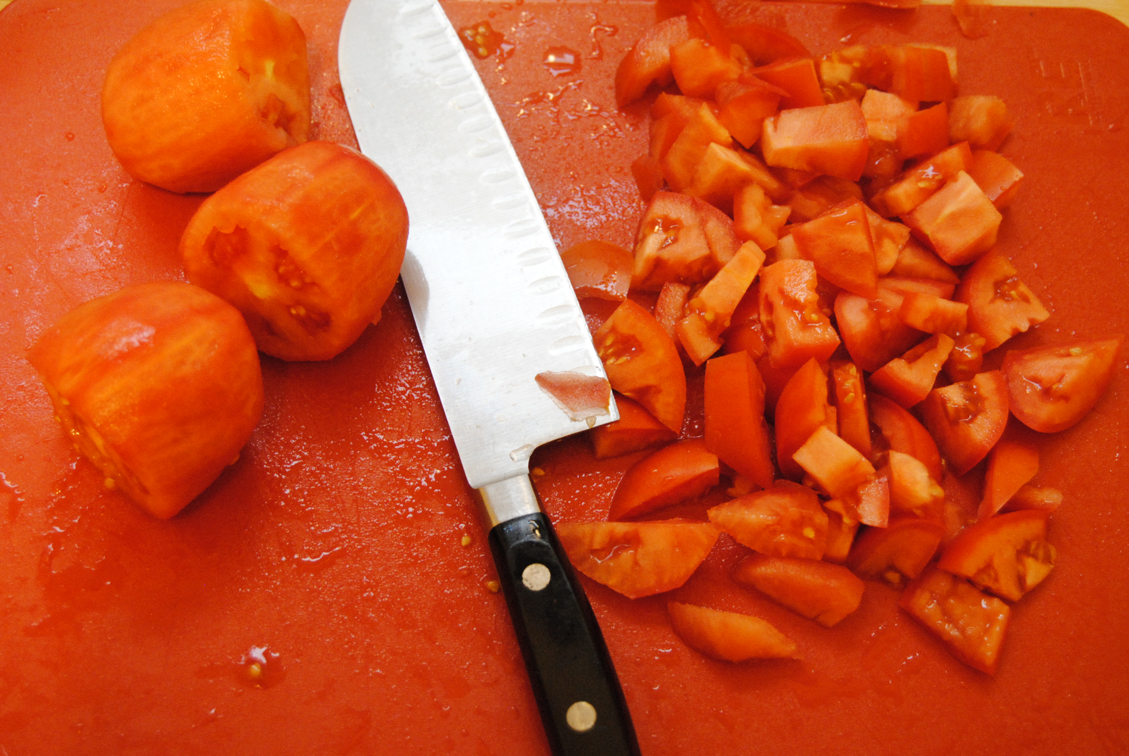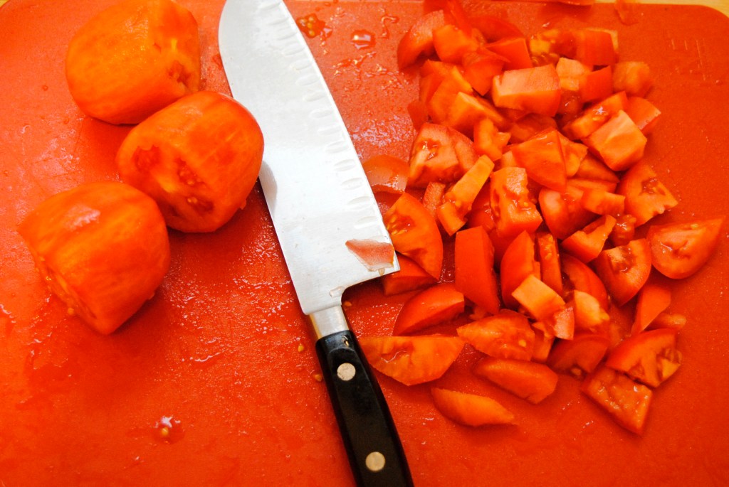 6 tomatoes; (2 chopped and 4 peeled + squeezed–you can just peel them with a peeler)