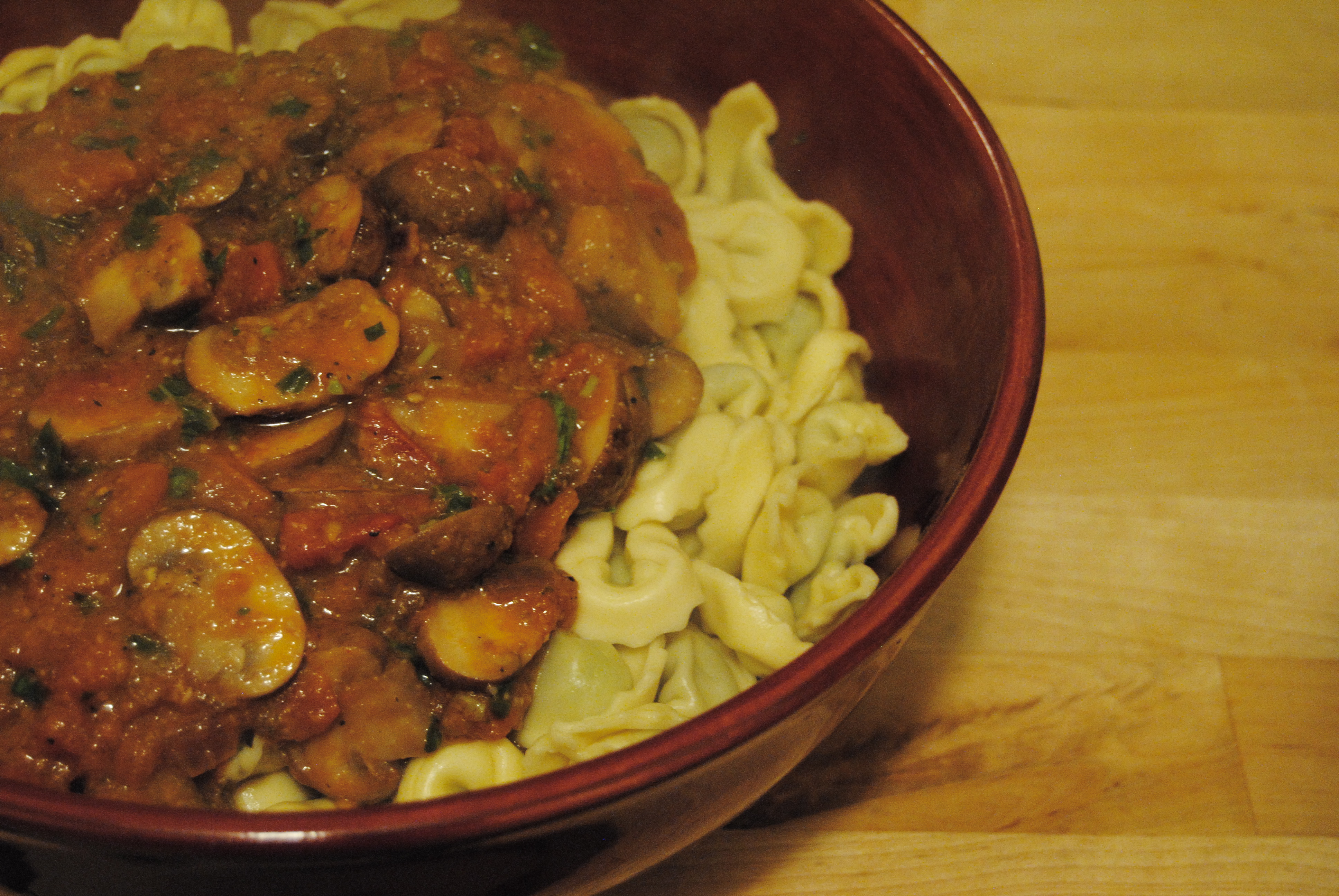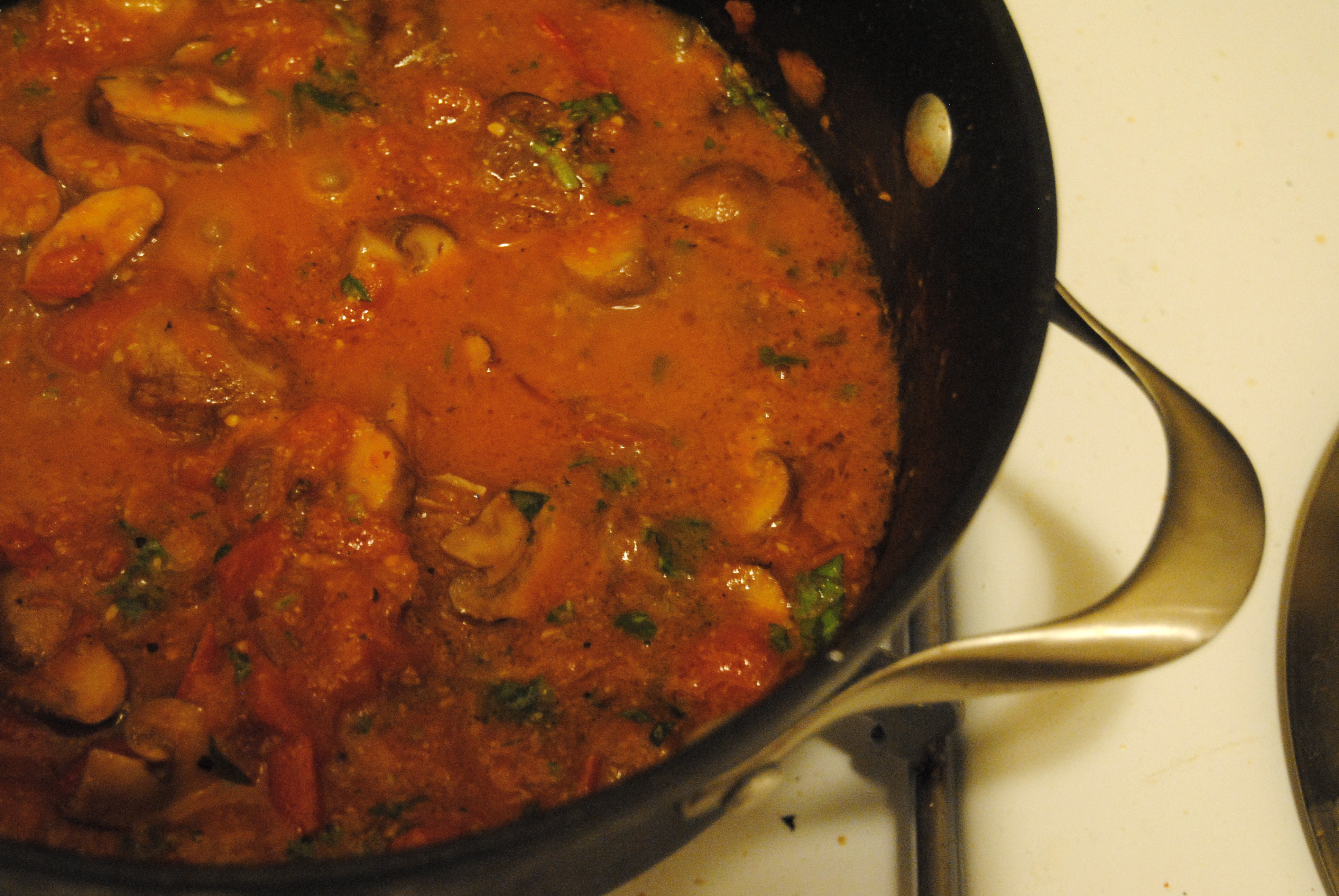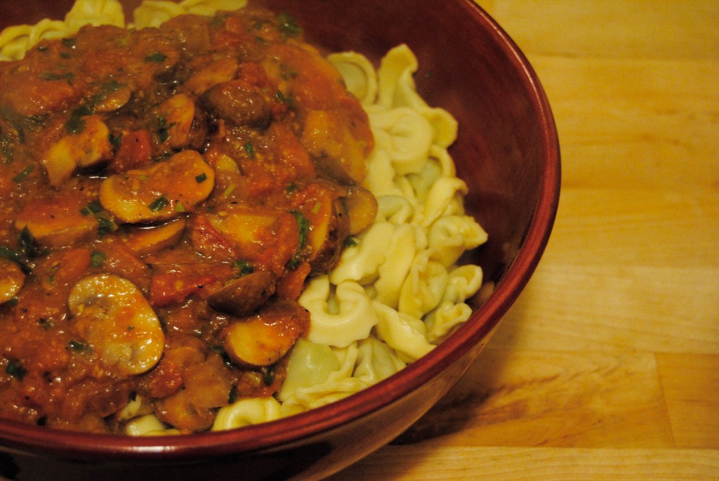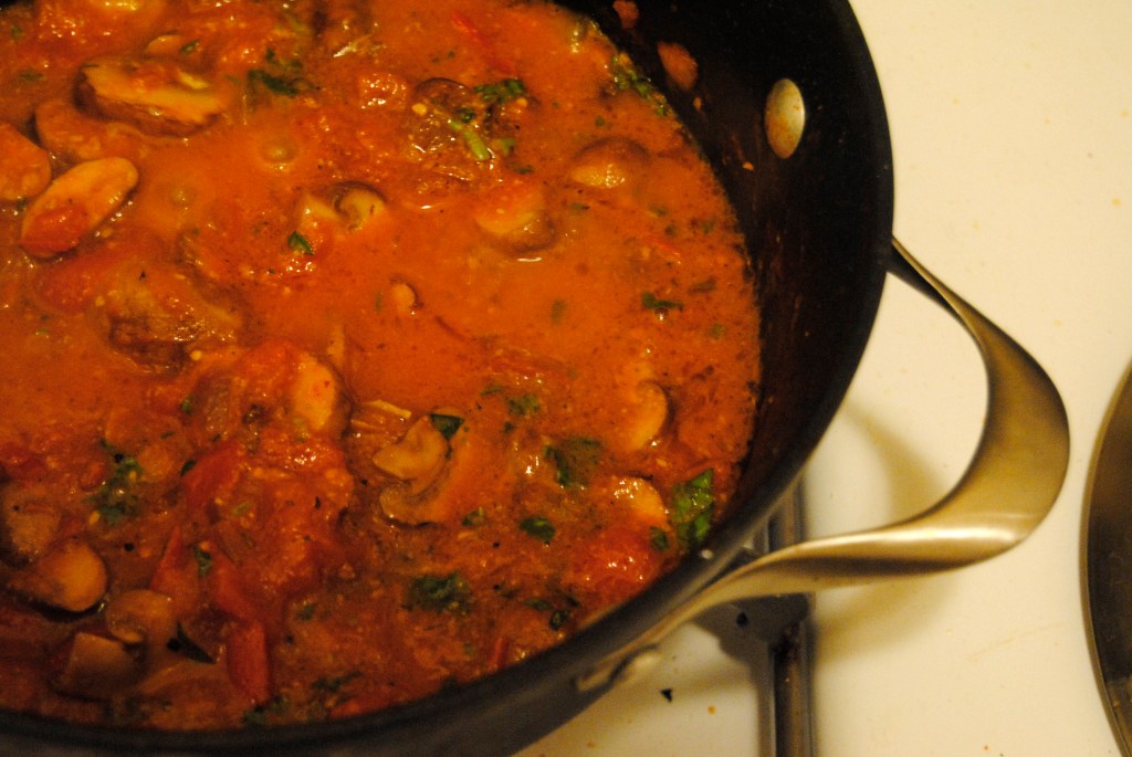 I don’t know that Adam thought about the repercussions of making such a delicious tomato sauce when he did a couple of weeks ago. Had he, I’m nearly certain he would have kept his talents under cover because we’ve had it four time since! That night, brainstorming dinner ideas, he very casually mentioned, “You know, I could make this really tasty tomato sauce that my aunt Danielle in Israel makes. She squeezes the tomatoes with her hands!” My eyes shot out of my head. Um, where have you been hiding this recipe, mister? It’s a good thing I have you locked into my future, otherwise I’d have to make a move fast!