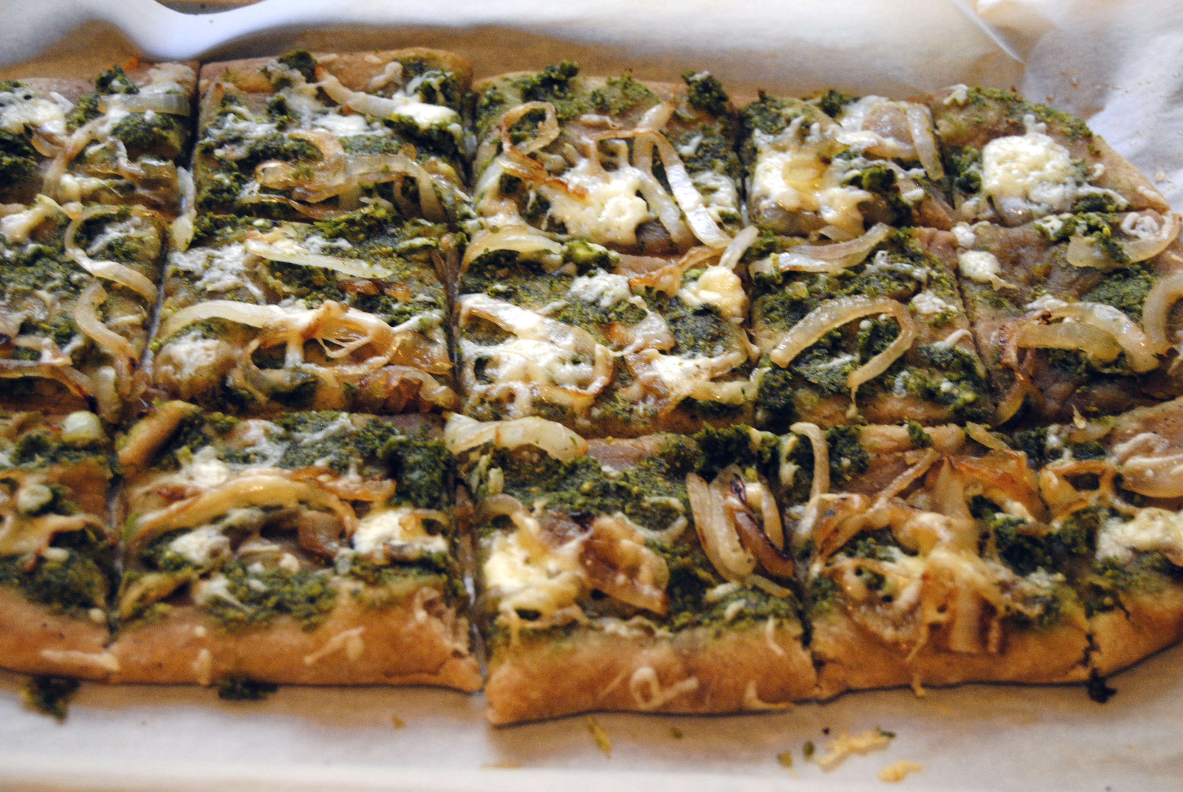 Just made your lemony pesto-onion flatbread for Super Bowl. It’s FABULOUS. I had to use pine nuts ’cause we didn’t have pistachios. Didn’t matter at all.
