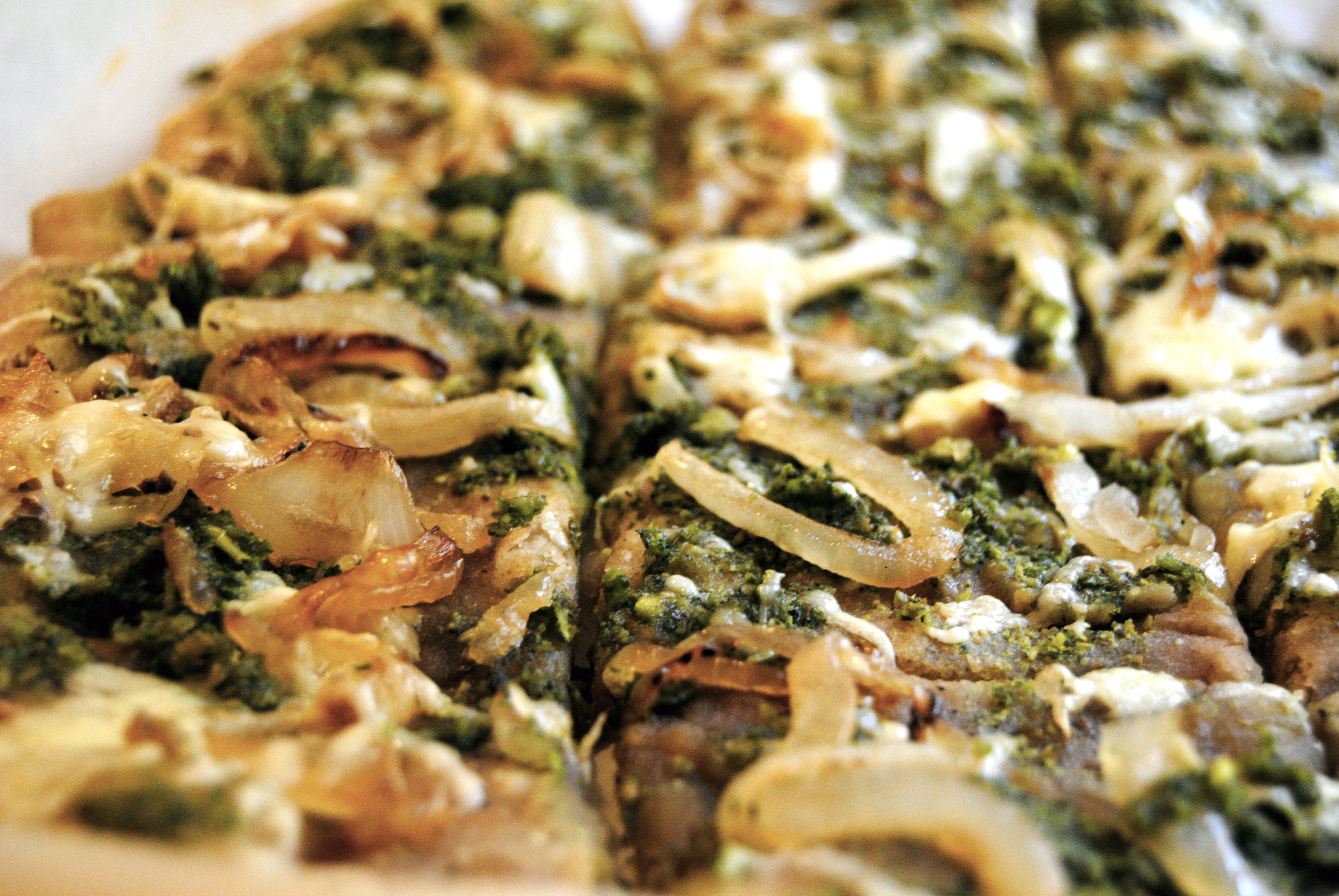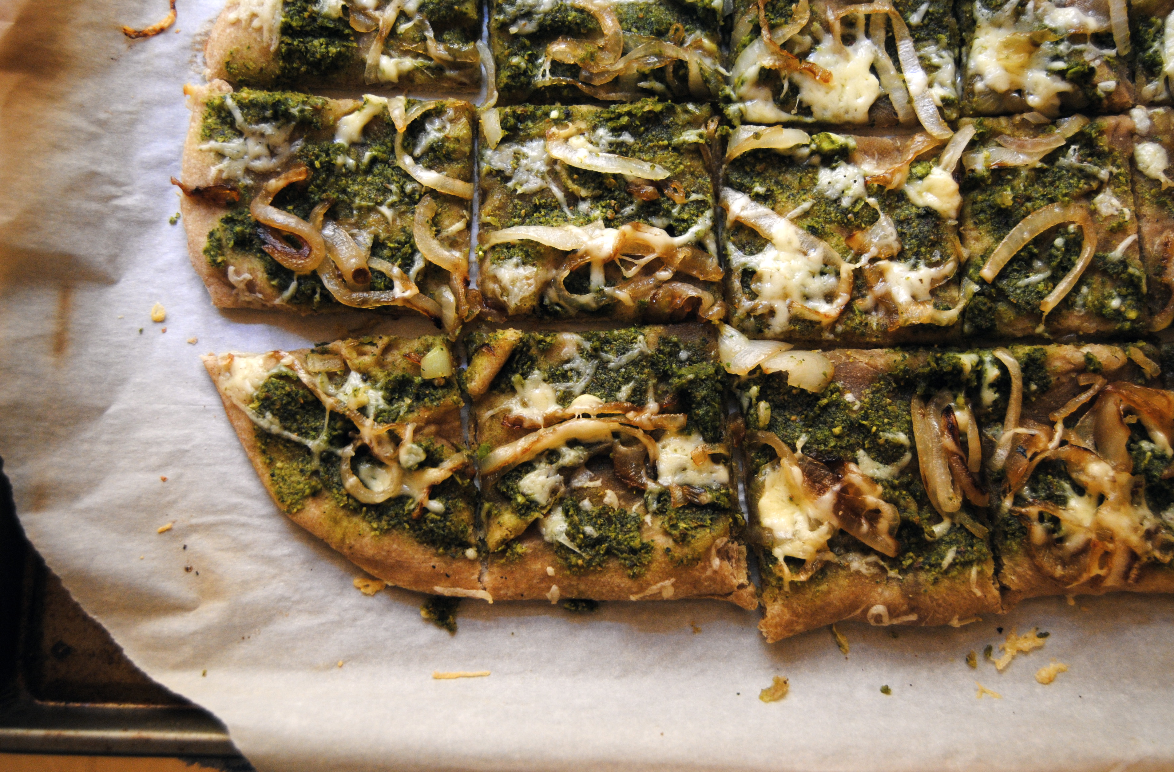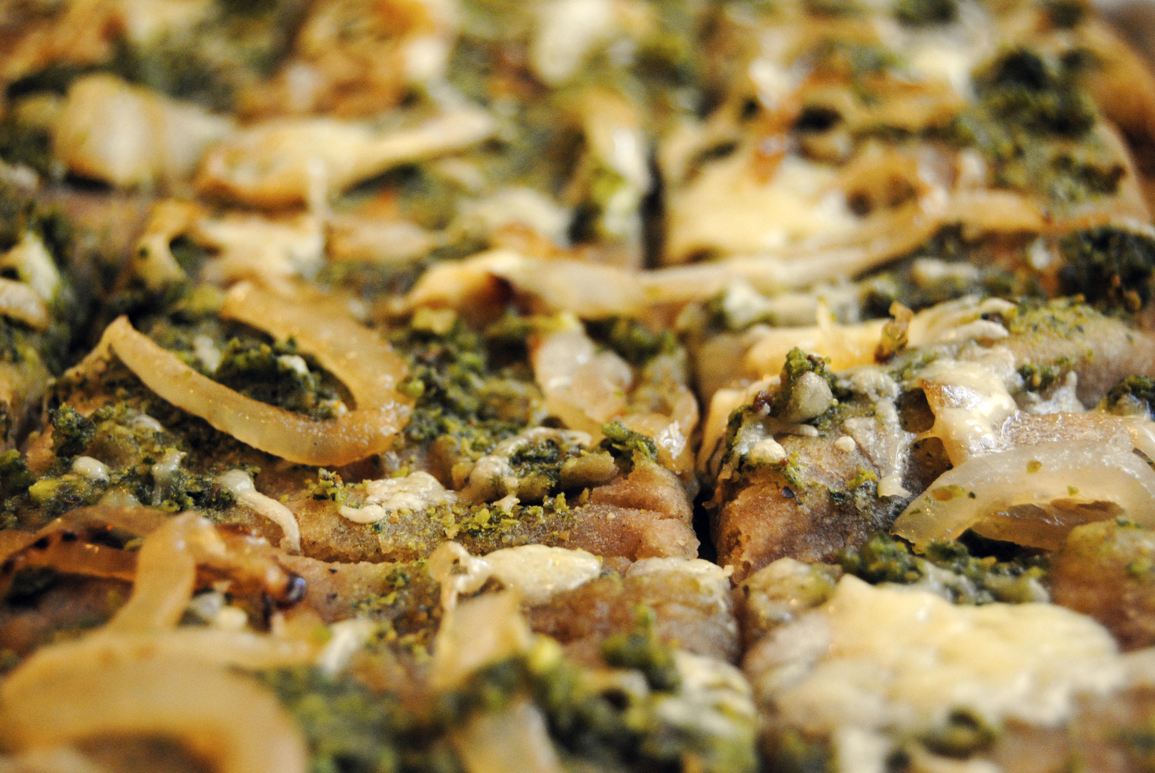 Preheat your oven to 450 F. Roll the dough out into a rectangle roughly 13 x 7 in – or whatever shape you prefer. Place the dough into the oven with a little olive oil painted onto the edges until the edges begin to brown. Slice your onion and cook with with the oil and sugar over medium heat until the onion browns and becomes soft. Meanwhile, throw all the “pesto” ingredients into a food processor until it looks like a paste. Remove the bread and spread the pesto all over it. You will probably have a little left over. When the onions look brown and crispy cover them all over the flatbread and sprinkle grated gouda evenly all over, including the edges. Place back into the oven for another 10 minutes or so – or at least until the cheese begins to bubble and the underside of the flatbread has browned. Enjoy!