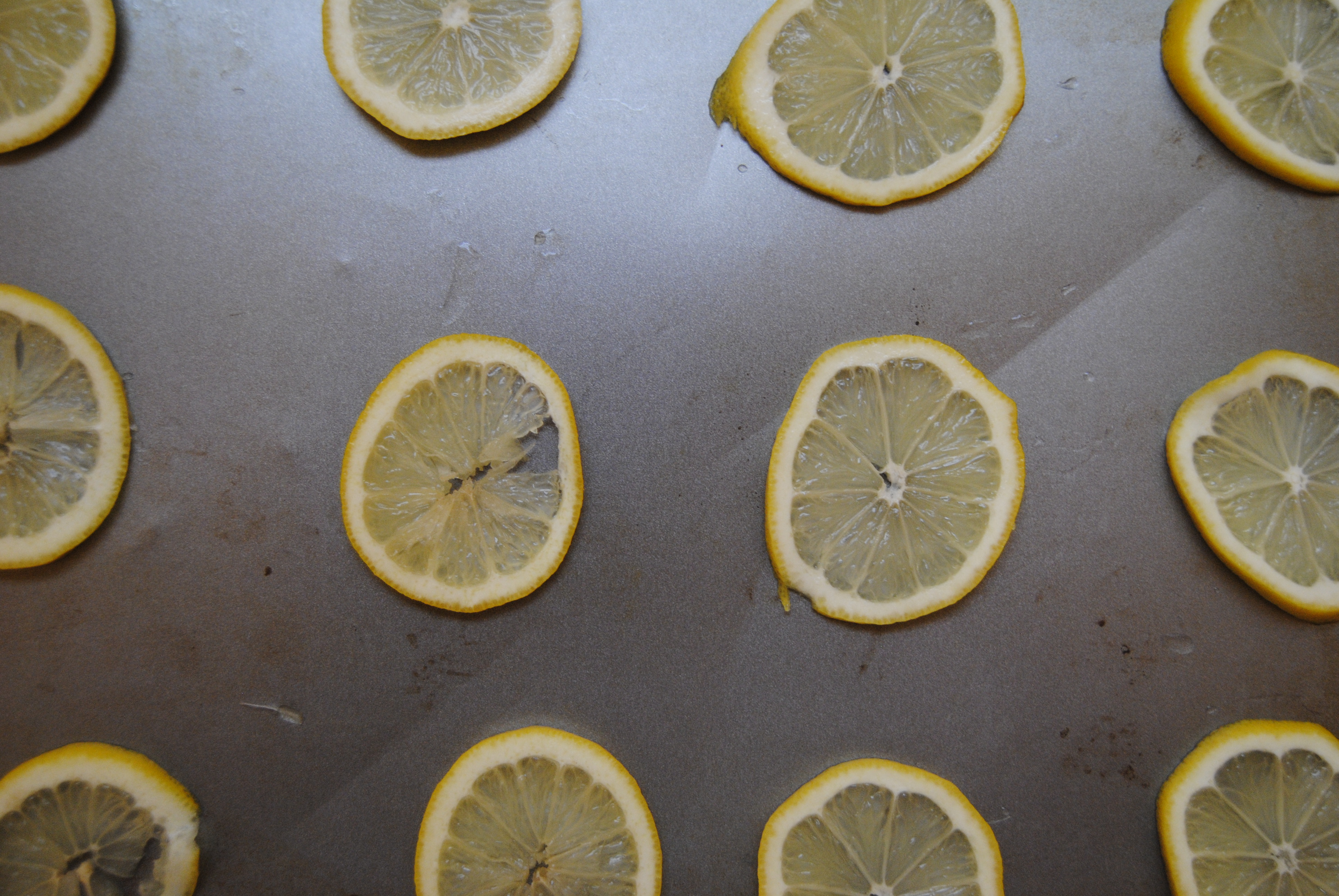 For the asparagus, spray a pan with PAM and arrange your sliced lemons across the pan.