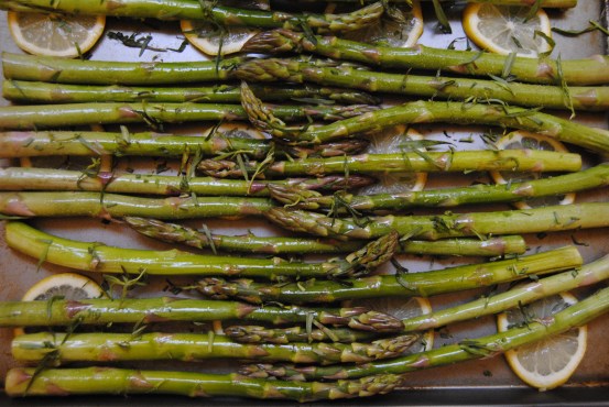 Toss asparagus with olive oil and salt.  Arrange asparagus over the lemons and sprinkle the tarragon all over the top. Place in oven for about 15 minutes or until the lemons begin to brown.