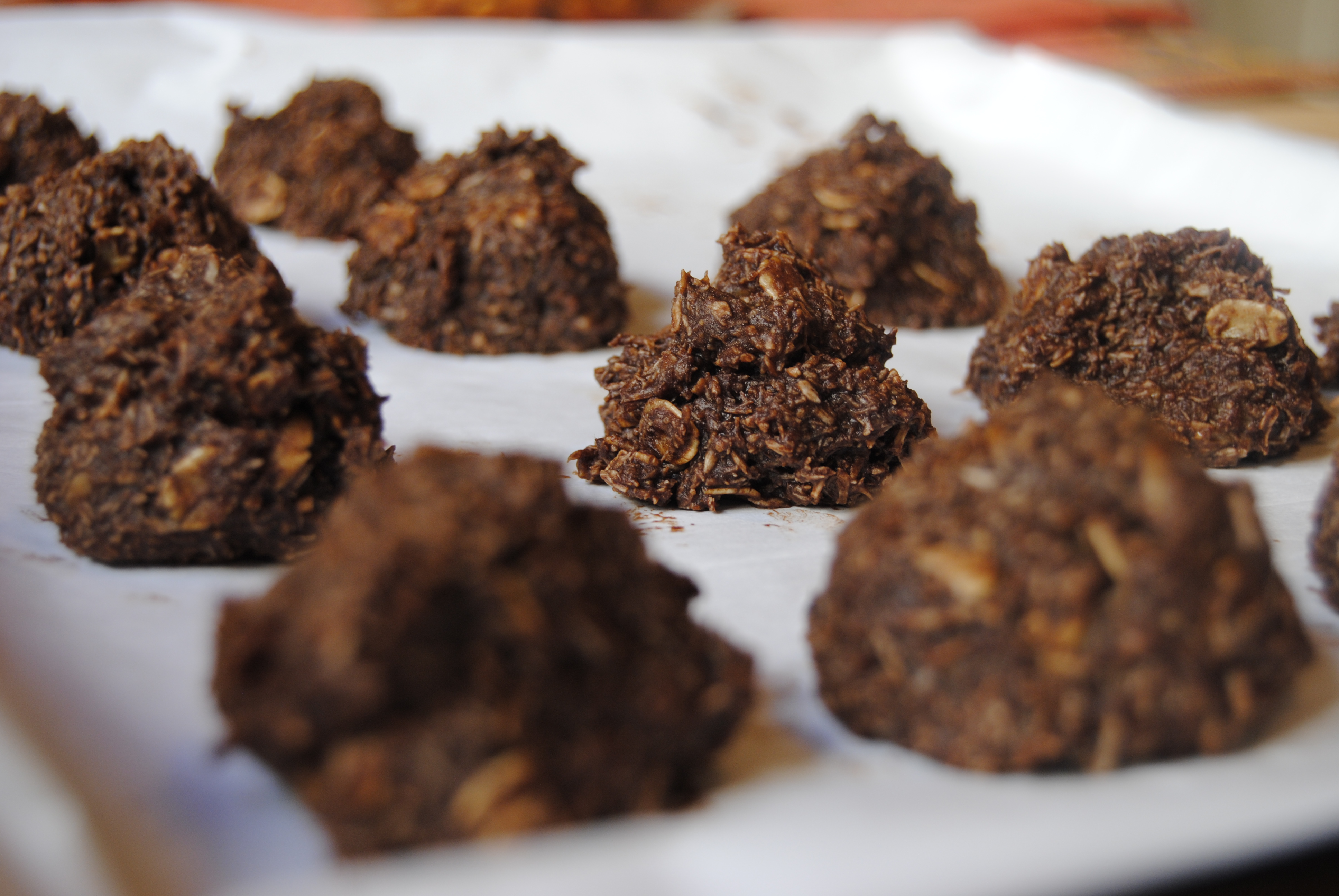 I apologize in advance for ruining your diet. I made these for a “healthy” dessert last night when I was craving something chocolatey. Coconut’s a fruit, right? Although individually they are not enough to ruin your diet, not being able to control yourself after eating just one might be. Ice cold balls of chewy coconut sweetened by agave nectar and cocoa powder and health food-ified by creamy peanut butter and rolled oats just in time for summer? No thank you, but YES PLEASE! There are just over 120 calories in each ball, so eat accordingly. But MAKE these. Recipe below.