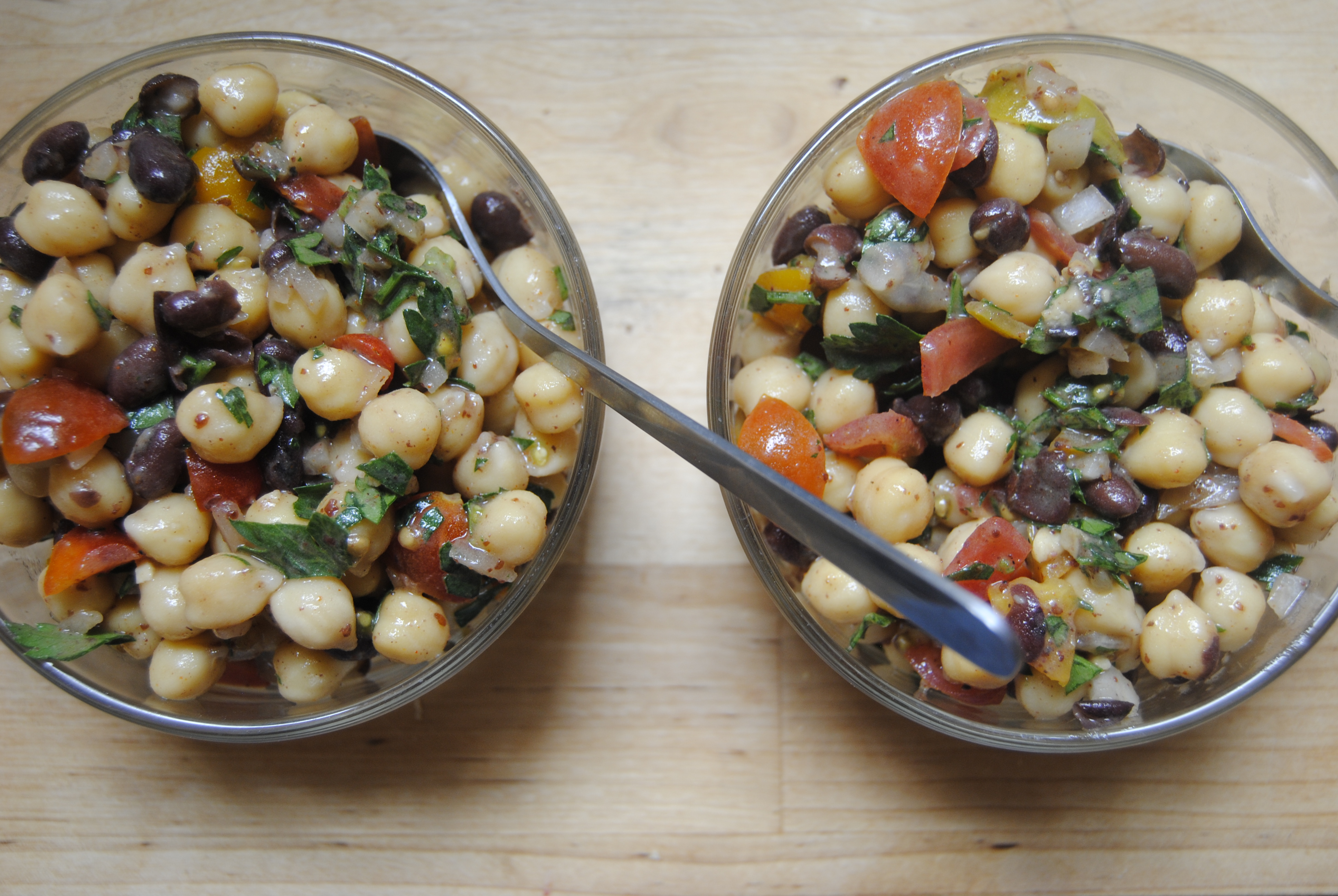 Soak the chickpeas overnight. Boil them for about 20 minutes, or until soft but NOT smushy. Mix all ingredients together, let sit for 10 minutes in fridge. Think about summer and smile. Enjoy!