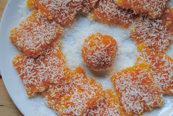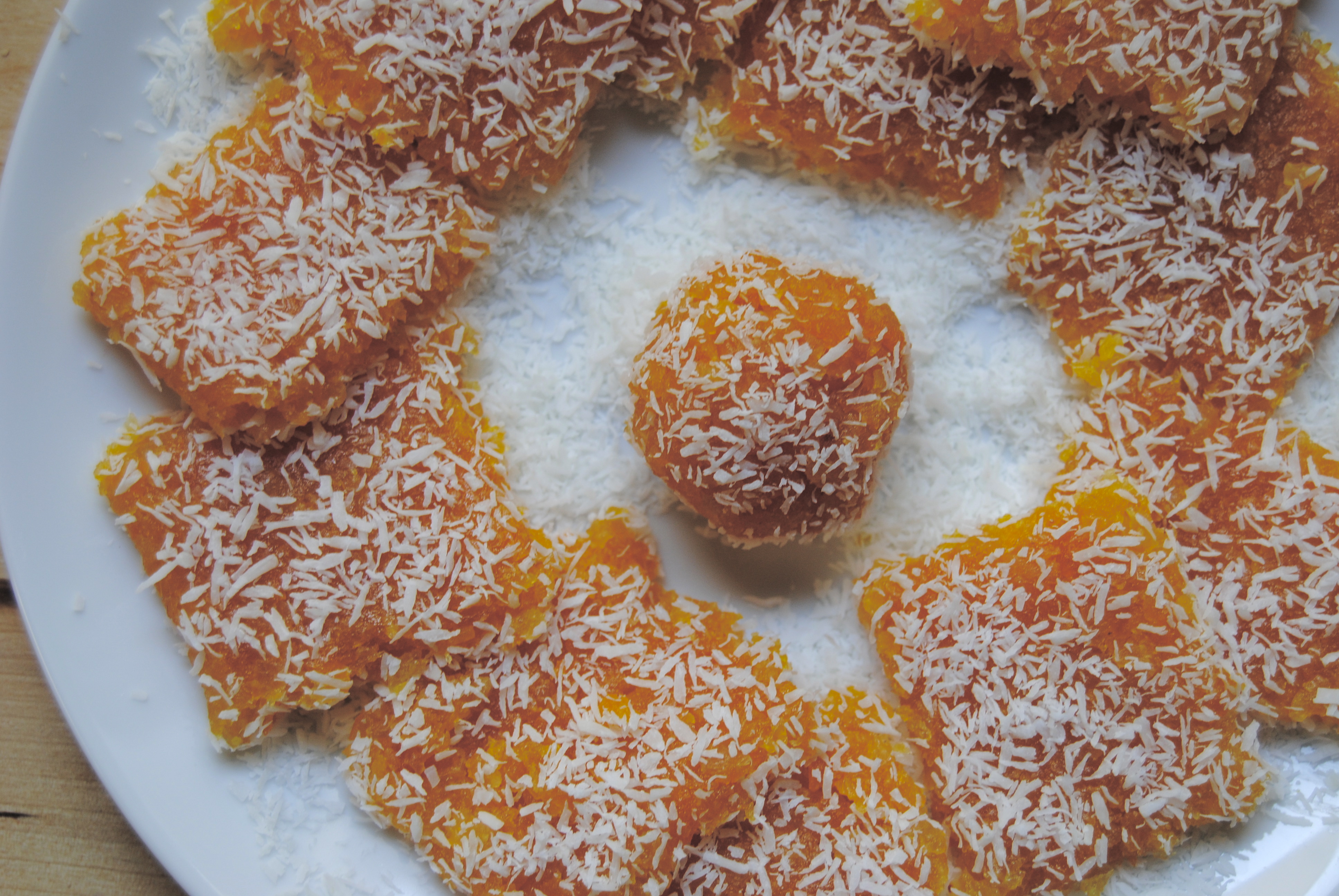 Ground up dried apricots covered in shredded coconut. Tastes like? Dried apricot. Not worth the effort of lifting my food processor.