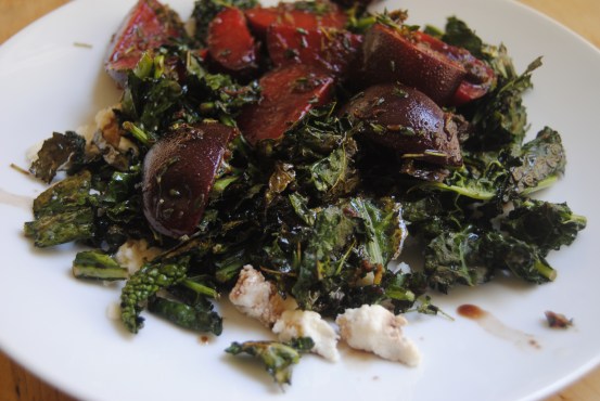 Turn on the oven to 450 F. Coat chopped kale with oil and a pinch or two of salt. Roast until slightly crispy but still a little soft (about 12 minutes in my crappy oven). Combine the oil, balsamic, agave, thyme, lemon zest and plums. Mix together. Add salt and pepper to taste. Remove the plums and set aside on a plate. Keep remaining vinaigrette. Place ricotta on a plate slightly crumbled and in no particular design. Remove the kale from the oven and add to the vinaigrette mixture. Toss. Lay the kale over the ricotta and then add the plums on top. Enjoy!!