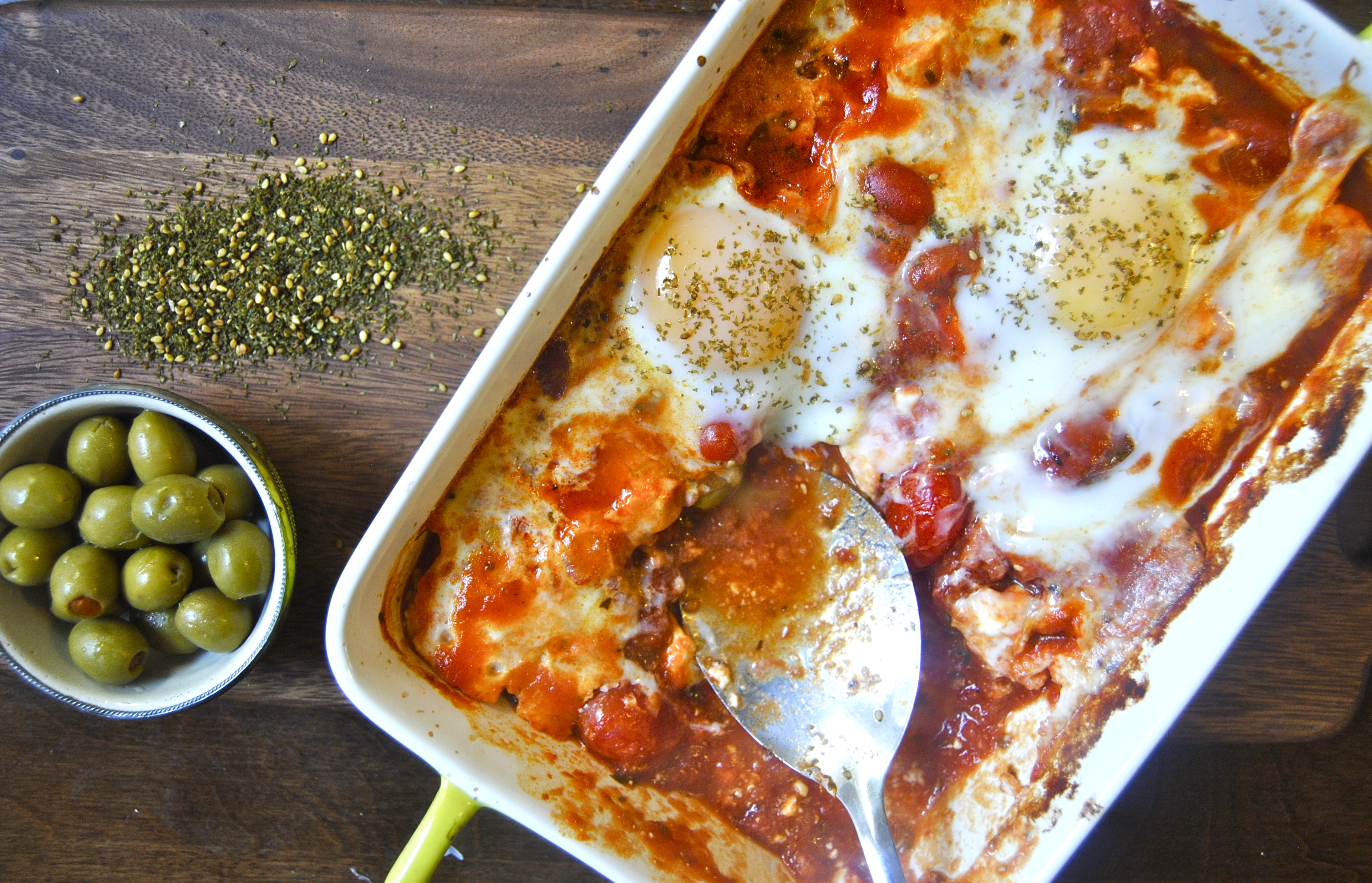 If you want to make a single portion, I would make something along the lines of a more traditional shakshuka. Saute a couple of minced garlic cloves in oil and butter (optional) over medium heat. Add the shallots, oregano, cumin seeds, salt & pepper and saute until the shallots begin to brown. Add the canned tomatoes, green olives, tomatoes, and feta. After a few minutes, crack one or two eggs on top and cook over medium heat. Sprinkle with zaatar! You can cover it with foil if you want the eggs to harden quicker. Hope this helps!