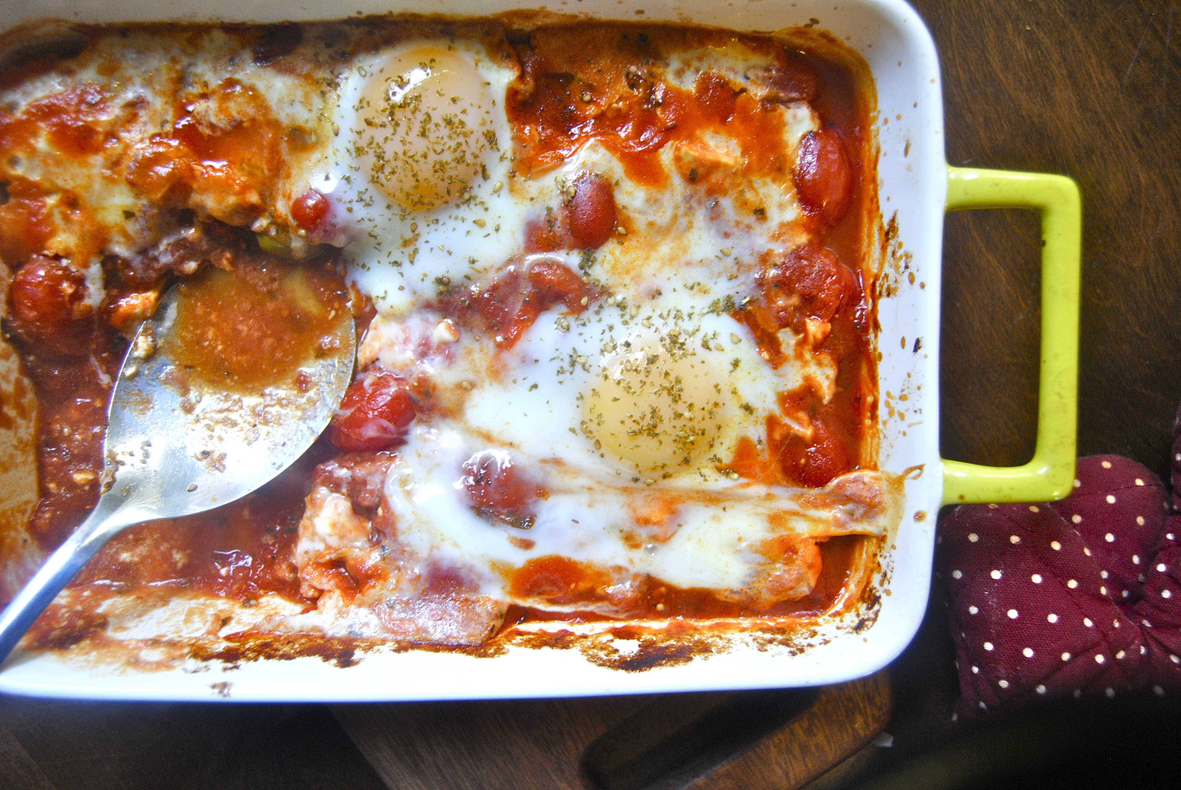 Remove from the oven and crack the eggs on top (with a fork, spread the whites of the eggs around so it bakes evenly). Cover with foil, turn the heat up to 400 F, return the dish to the oven and remove when the eggs look cooked (about 10 mins). Serve with a hunk of your favorite bread! Enjoy!