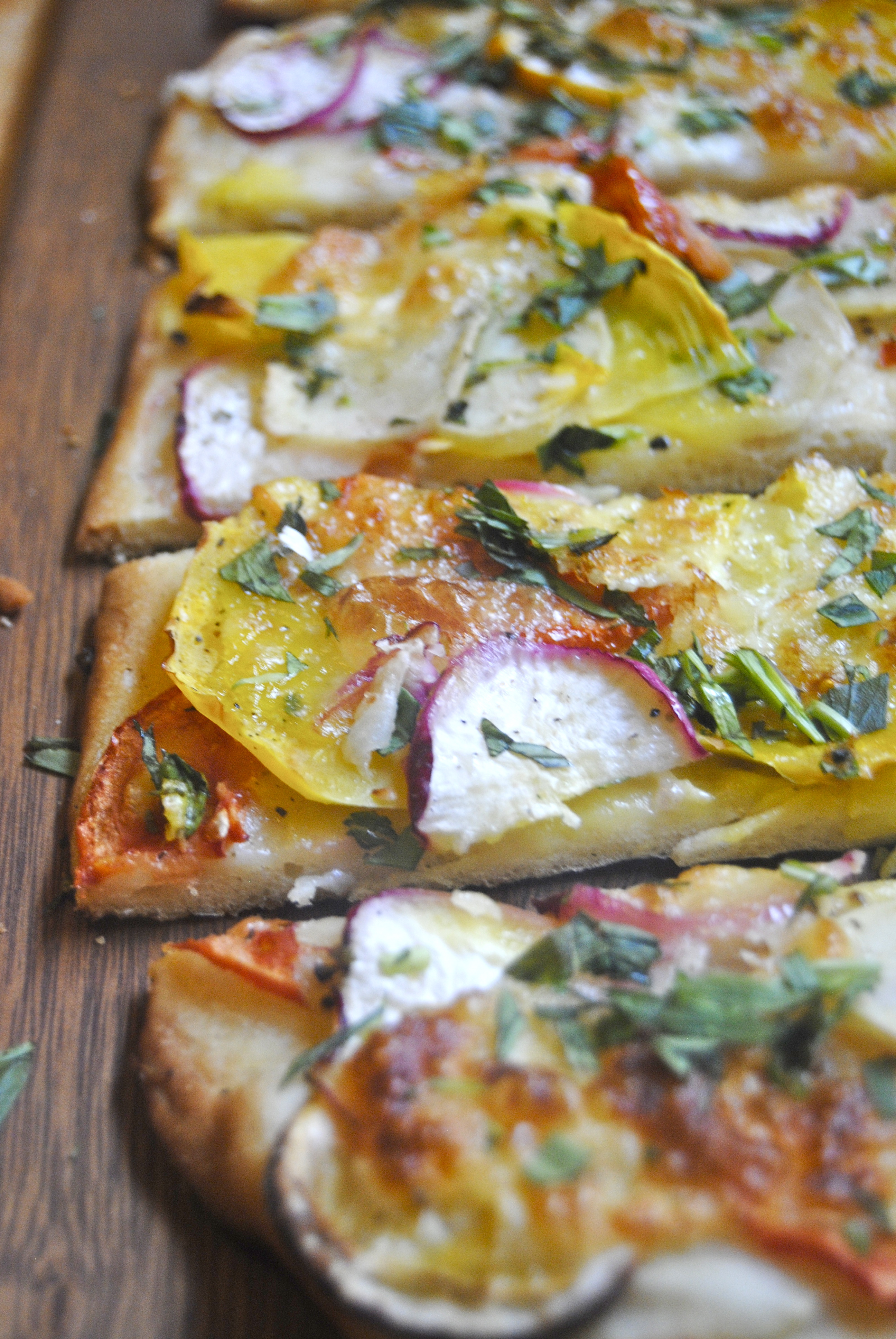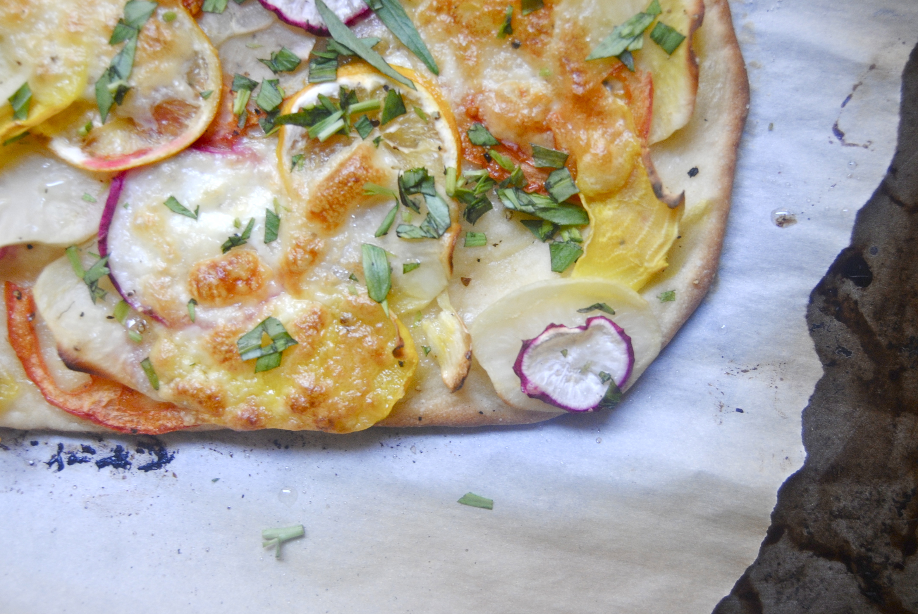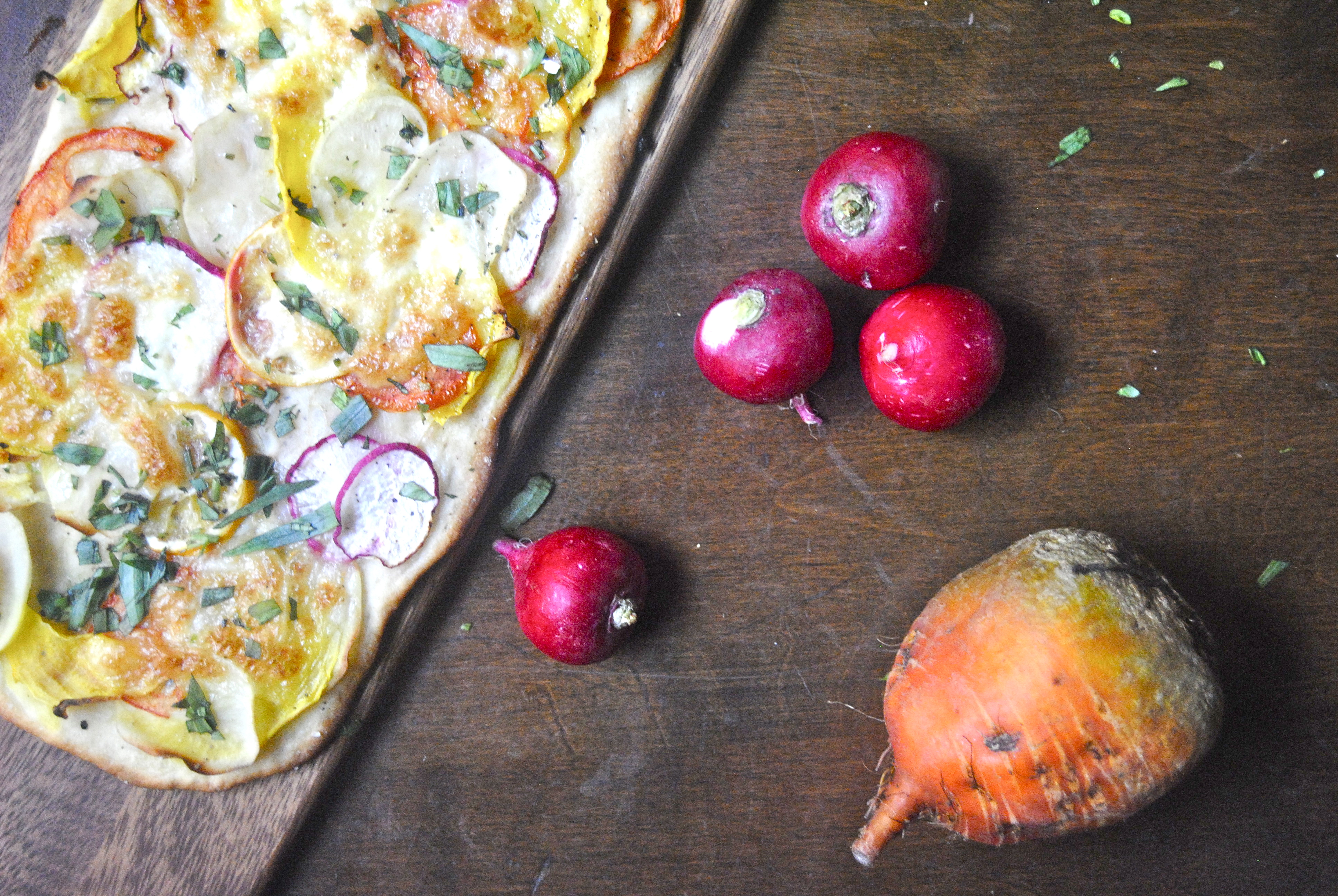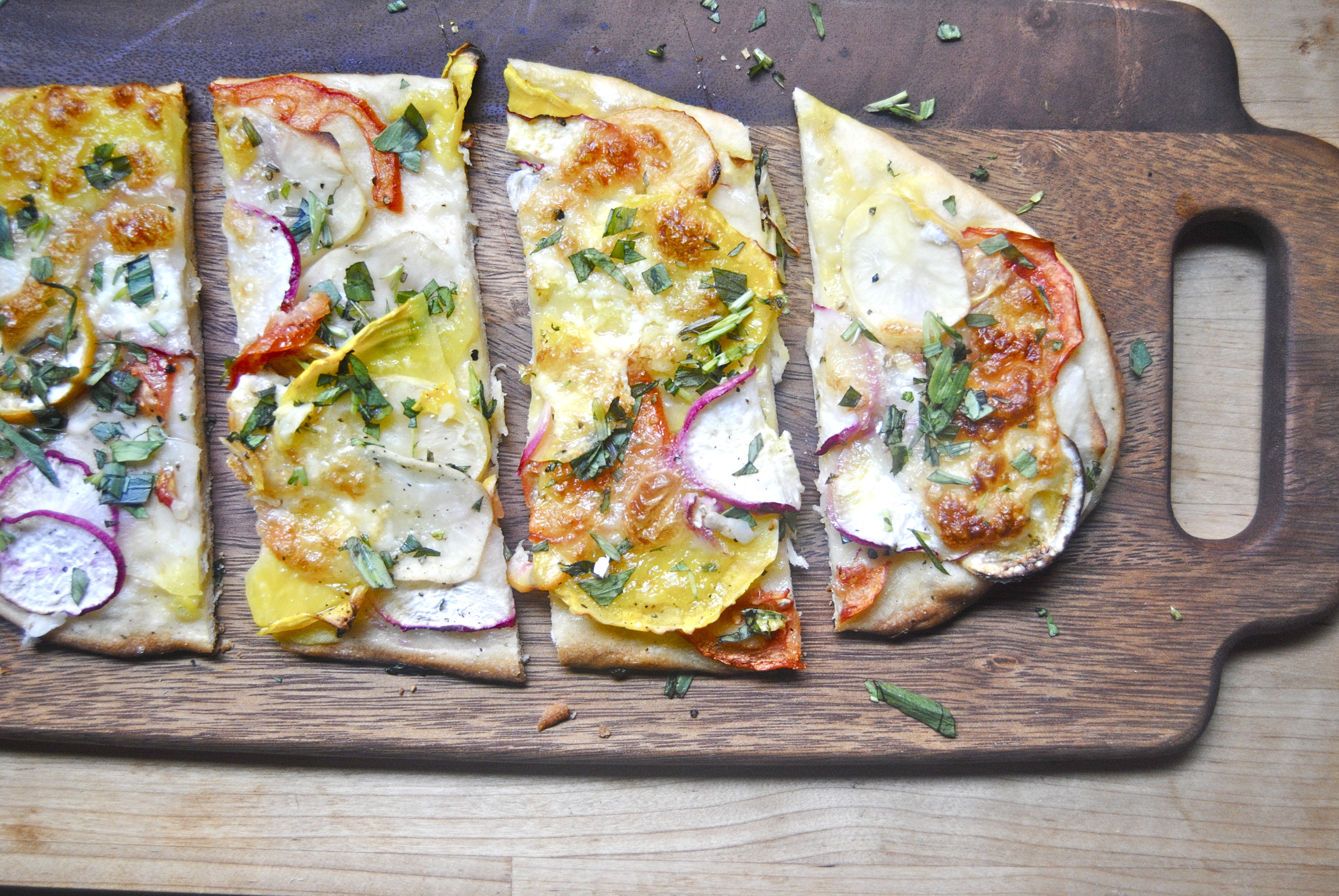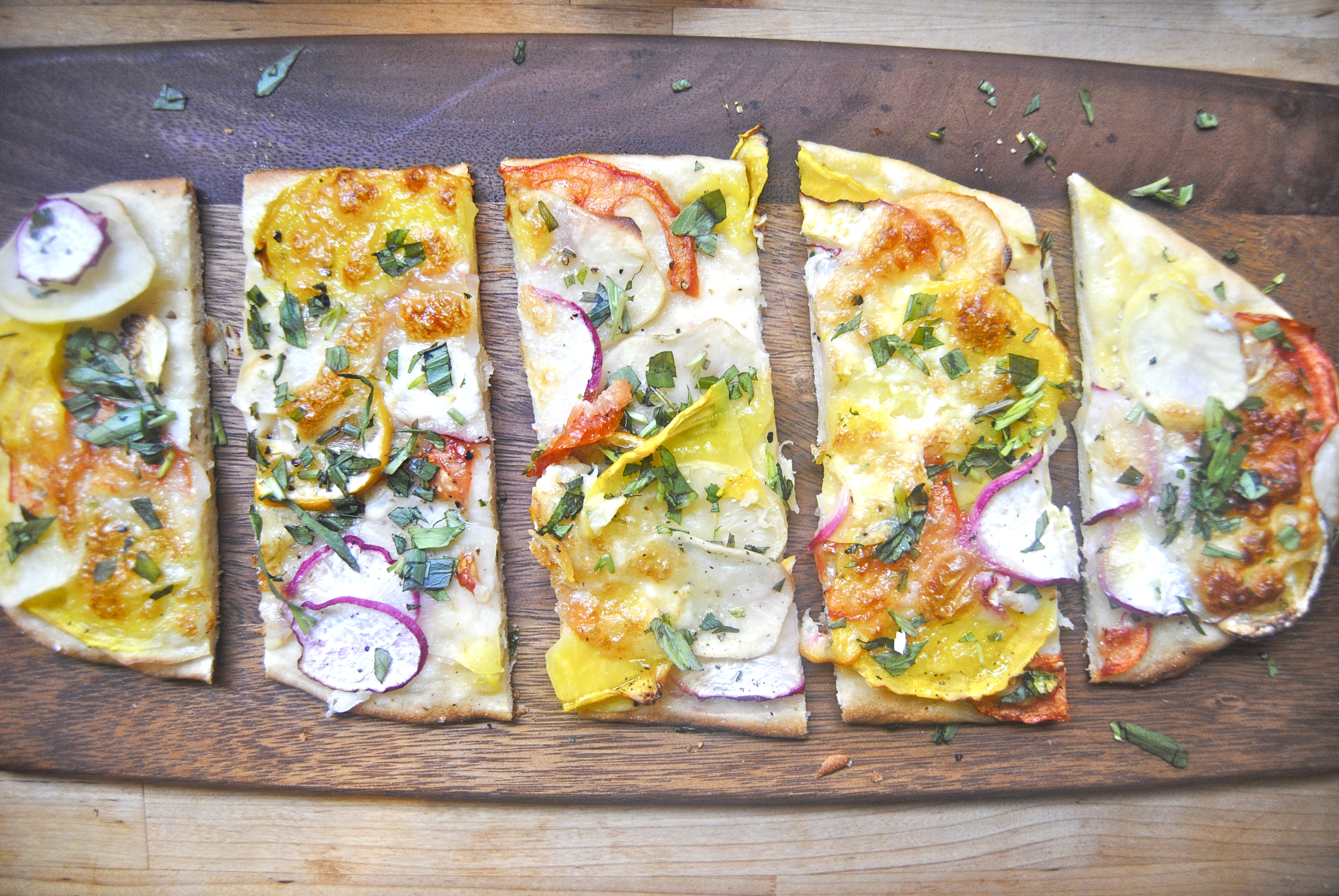 For the toppings: Preheat your oven to 375 F. Roll out the flatbread. Brush (with your fingers or brush) the olive oil all over, including on the edges. Rub the crushed garlic all over the dough, allowing pieces to break off randomly. If they seem large, just cut them a bit and place randomly. Sprinkle with the salt (reserving the pinch for later). Lay the toppings, alternating among the vegetables for color and completely covering the dough. Try and place the lemons in different places and same with the tomatoes (just for color, really). Dollop the cheese. When you’re finished, sprinkle with the pinch of salt. Place in the oven and cook for about 20-25 minutes or until the edges of the pizza have browned and the vegetables look fairly crisped. Top with tarragon and serve. Enjoy!