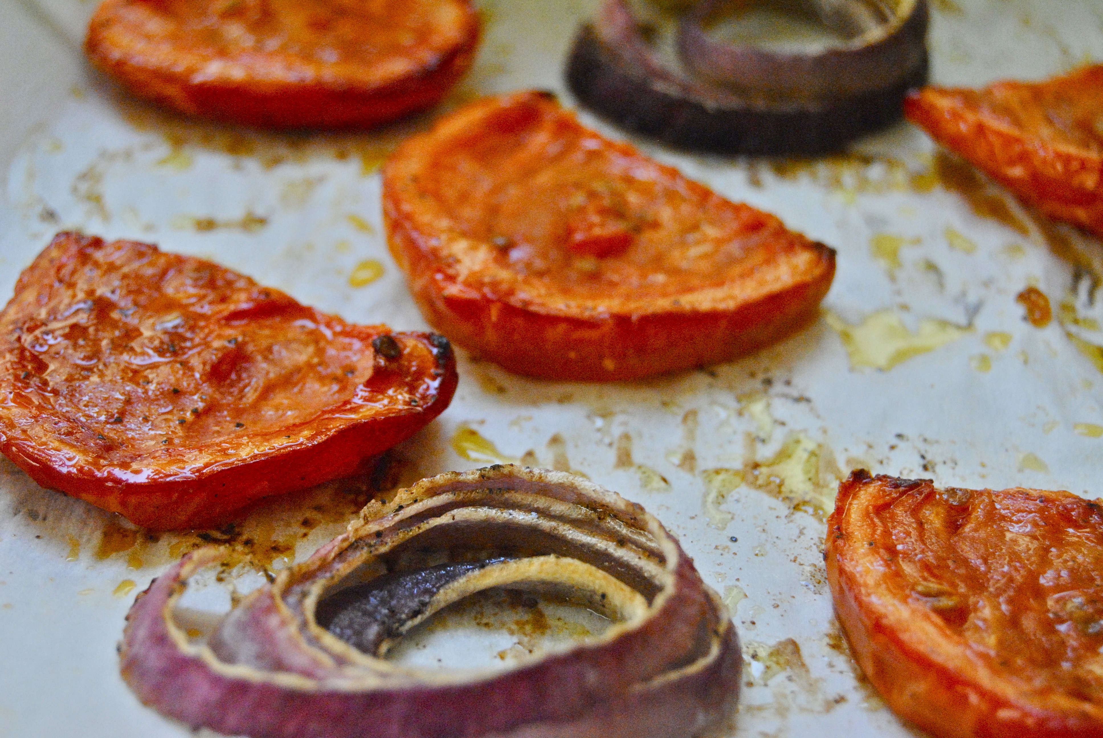 A couple of hours later, my minimal counter space was adorned with oven-roasted tomatoes and red onions. Chopped lemon bits were sprinkled all over the floor, and a lemon and garlic sauce was simmering on the stove, wafting — well, not really wafting through our apartment because we have relentlessly horrible circulation — but it was definitely filling the kitchen with a spring-time aroma.