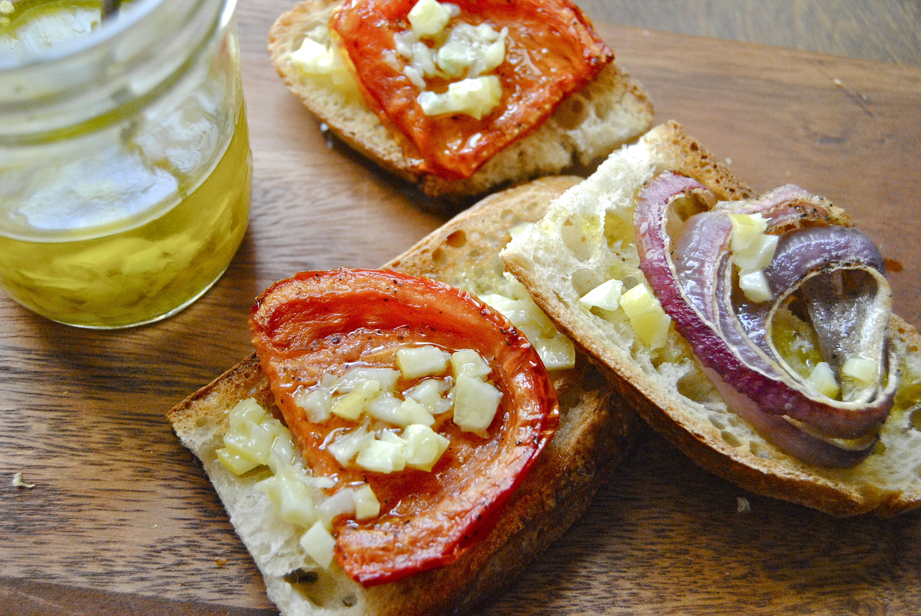 Toast some sourdough bread, place tomato/onion, and top with the lemon & garlic sauce. Enjoy!