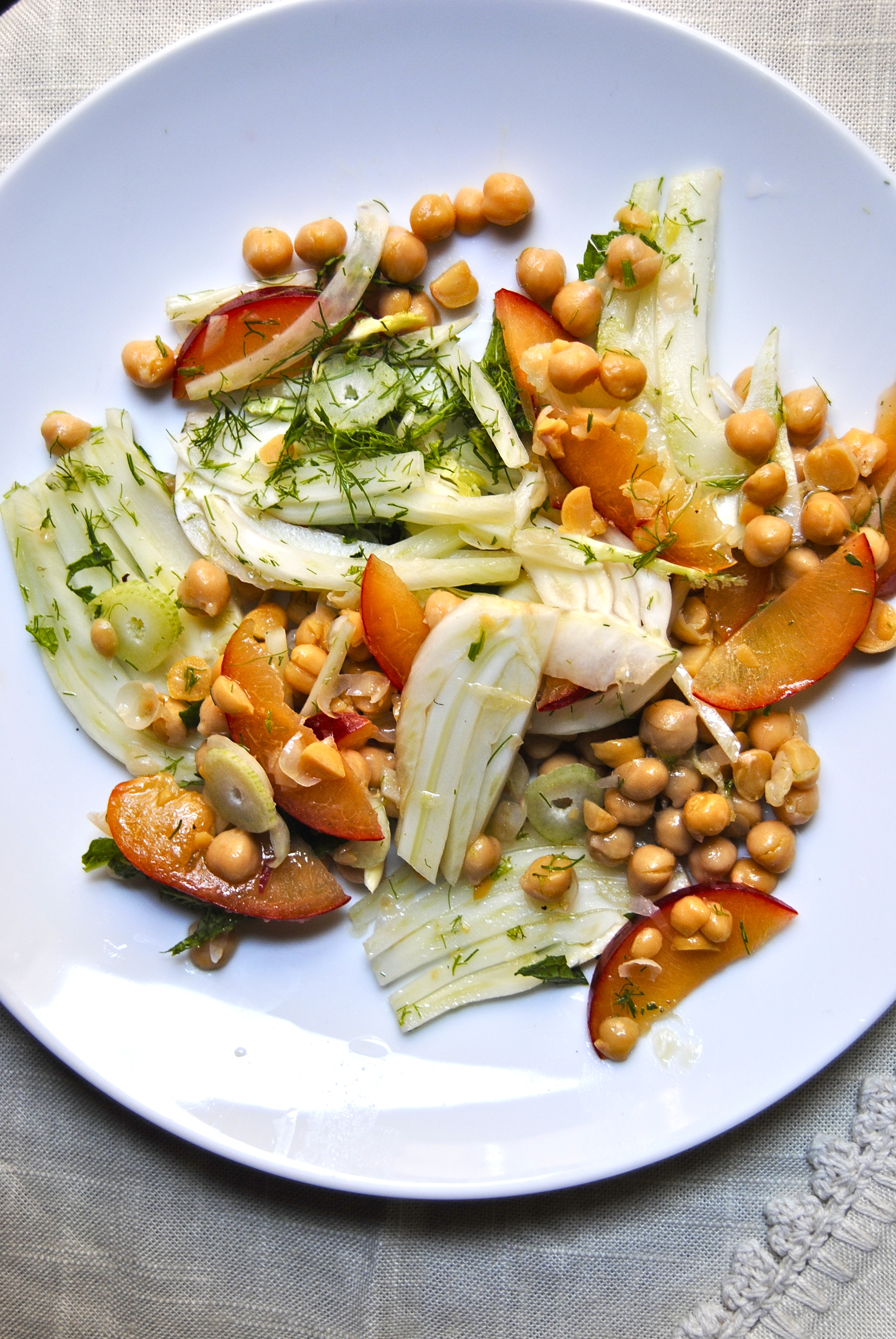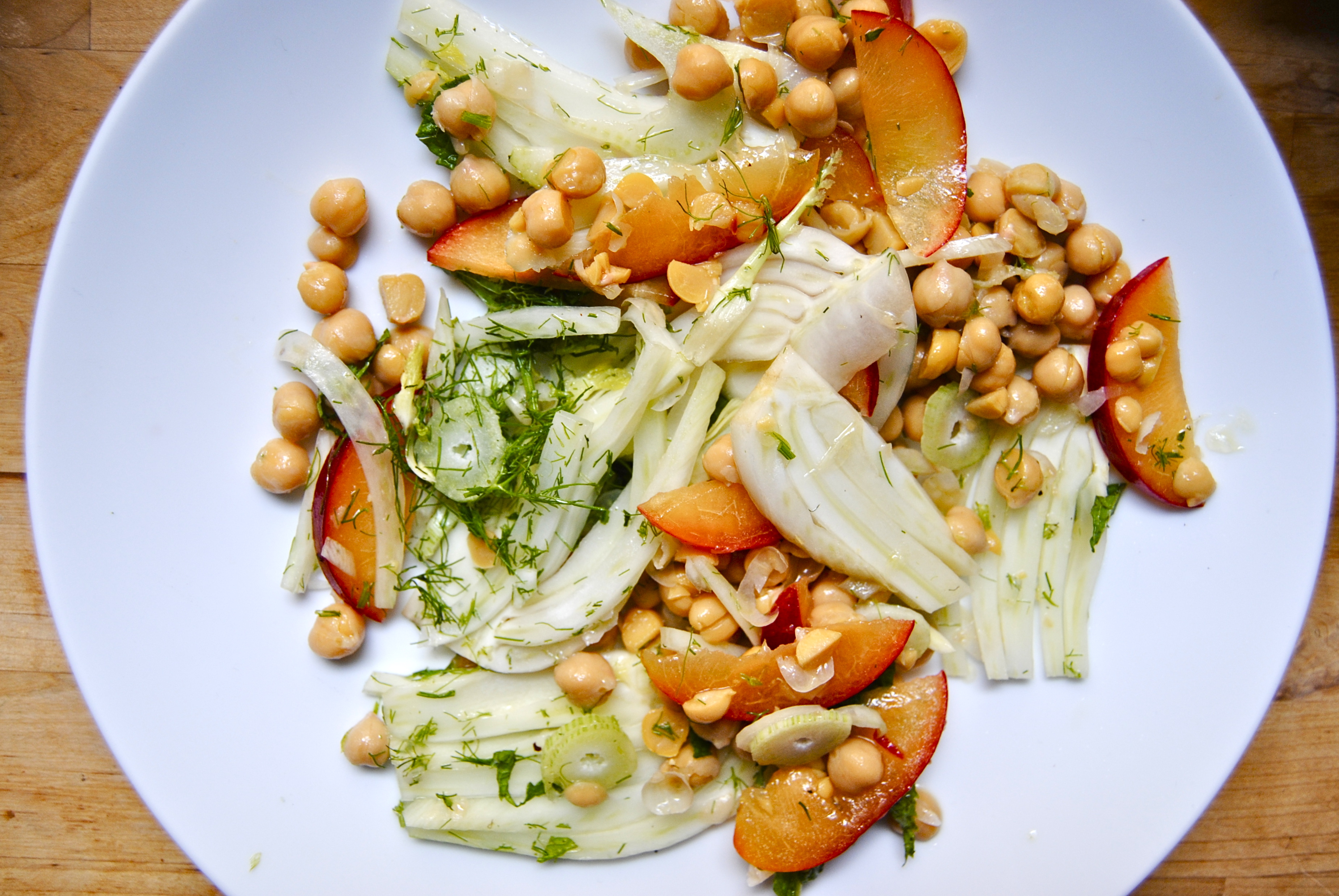 Remove the lemon peels and the fruit of the lemons from the pith. Smell your fingers. Squeeze the fruit into a bowl along with the pieces. Mix in the oil, salt, pepper, sherry, and agave. Add the plums and chickpeas and mix well. Add the fennel, garnish with the fennel leaves and mint. Enjoy!