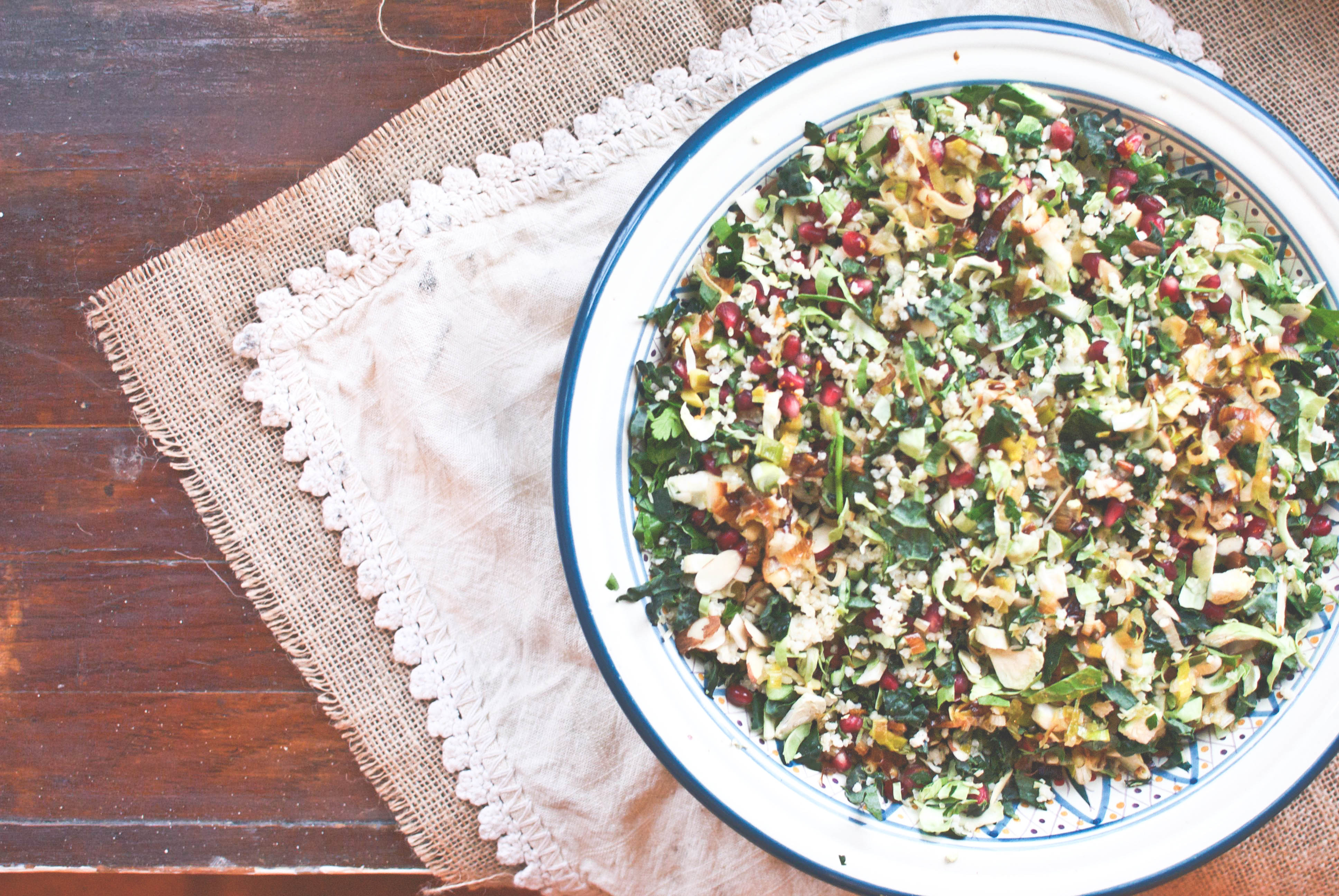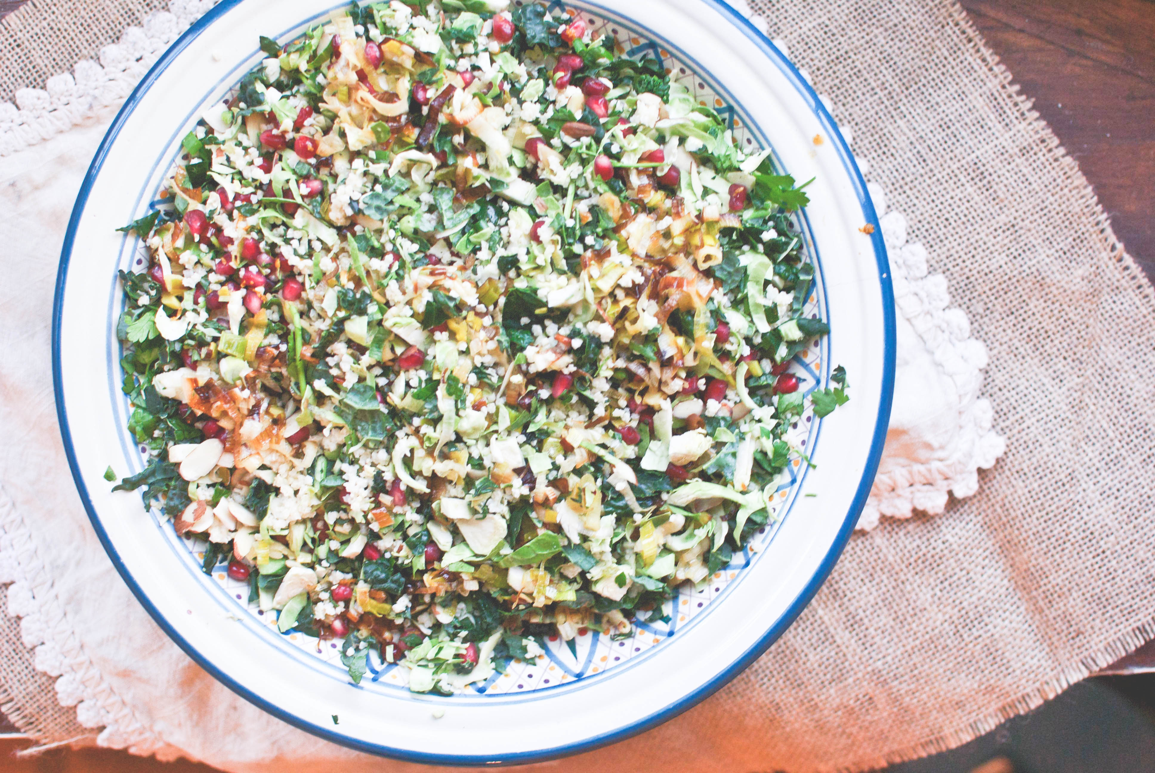 Mix the salad ingredients in any order you want. If you’re using the roasted leeks, preheat your oven to 400 F. Toss the chopped leeks with a couple tablespoons of olive oil, salt + pepper. Roast until crispy (approx 20 minutes), shaking the pan about halfway through. Wait till they cool to top on the salad. Enjoy!