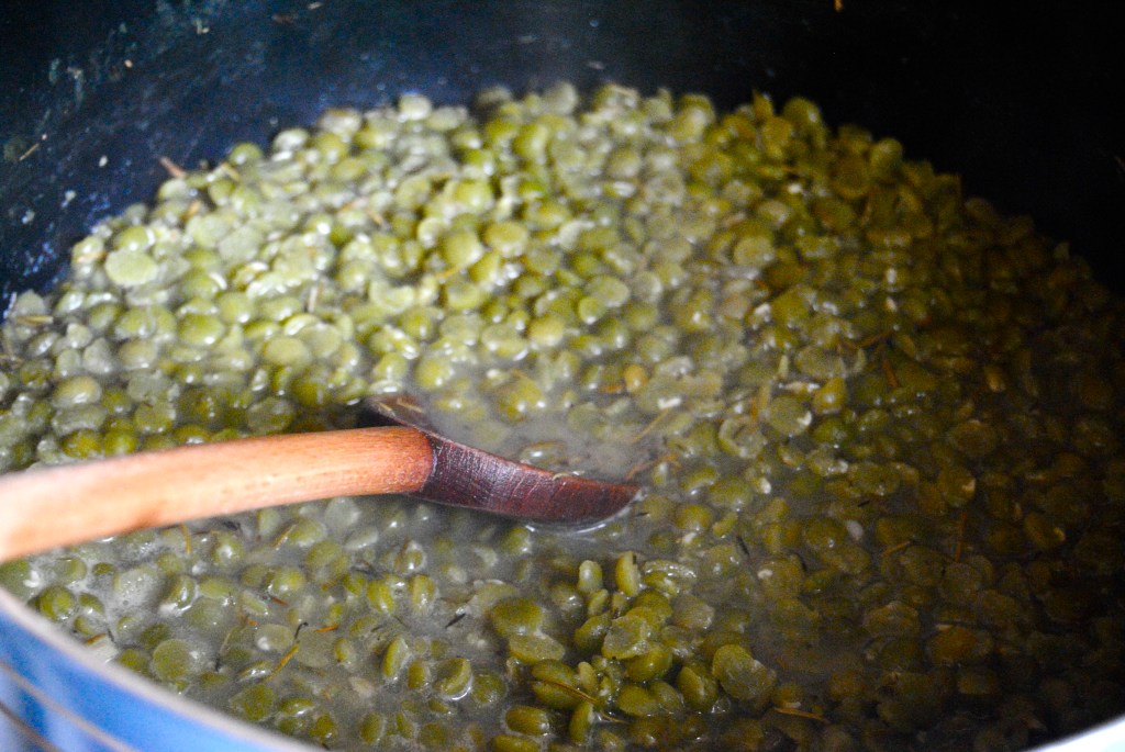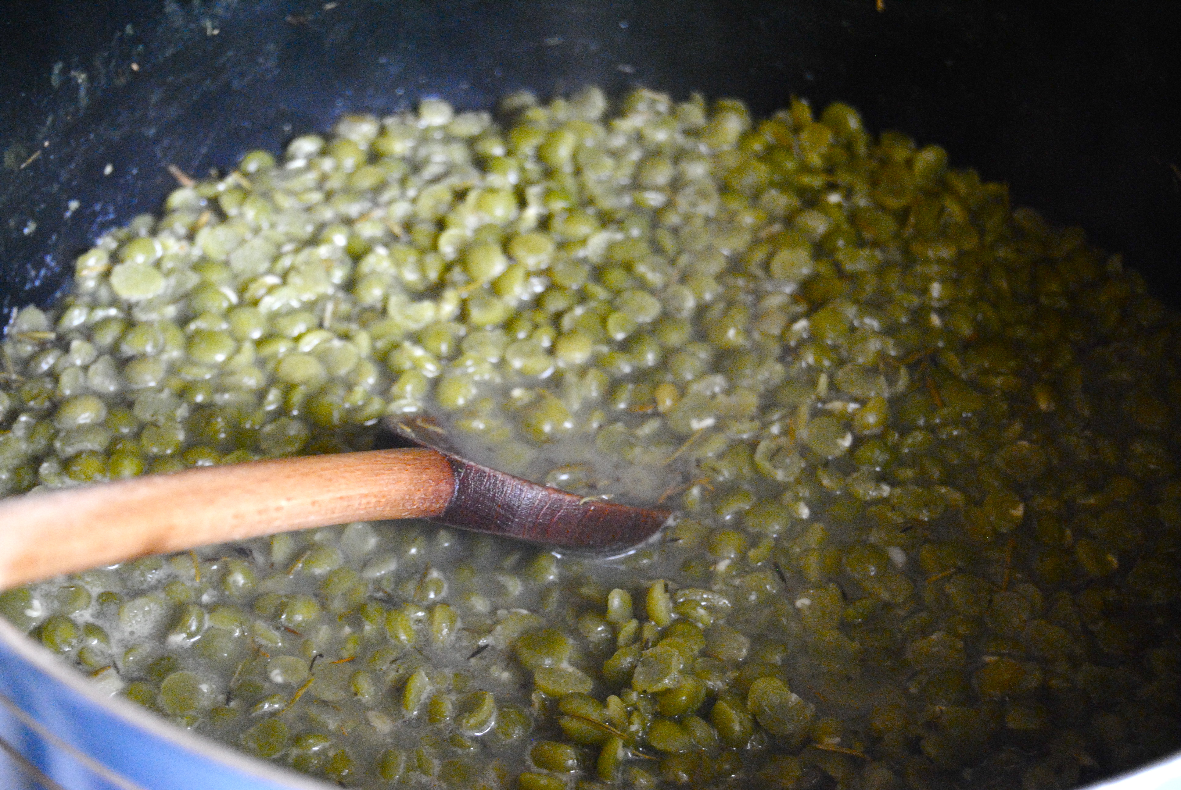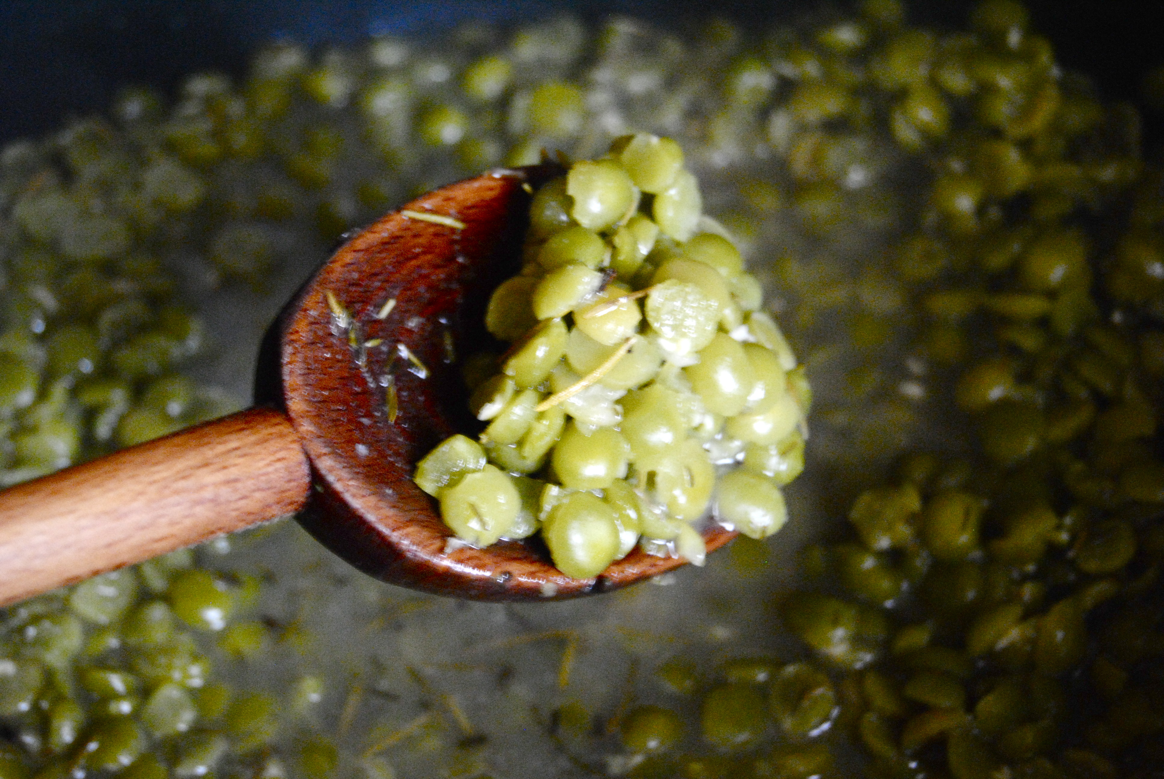 Heat up the oil in your pot over med-high heat. Once they turn slightly goldeny brown, add some salt, give it a quick stir and add your peas, broth, water, and herbs. Cover until it boils and then lift the lid slightly ajar for about 30 minutes. Use a blender or immersion blender to puree the soup. Serve with big chunks of sourdough bread, or toast some of them to make croutons. Can top with a little parmesan cheese, if you like. Enjoy!