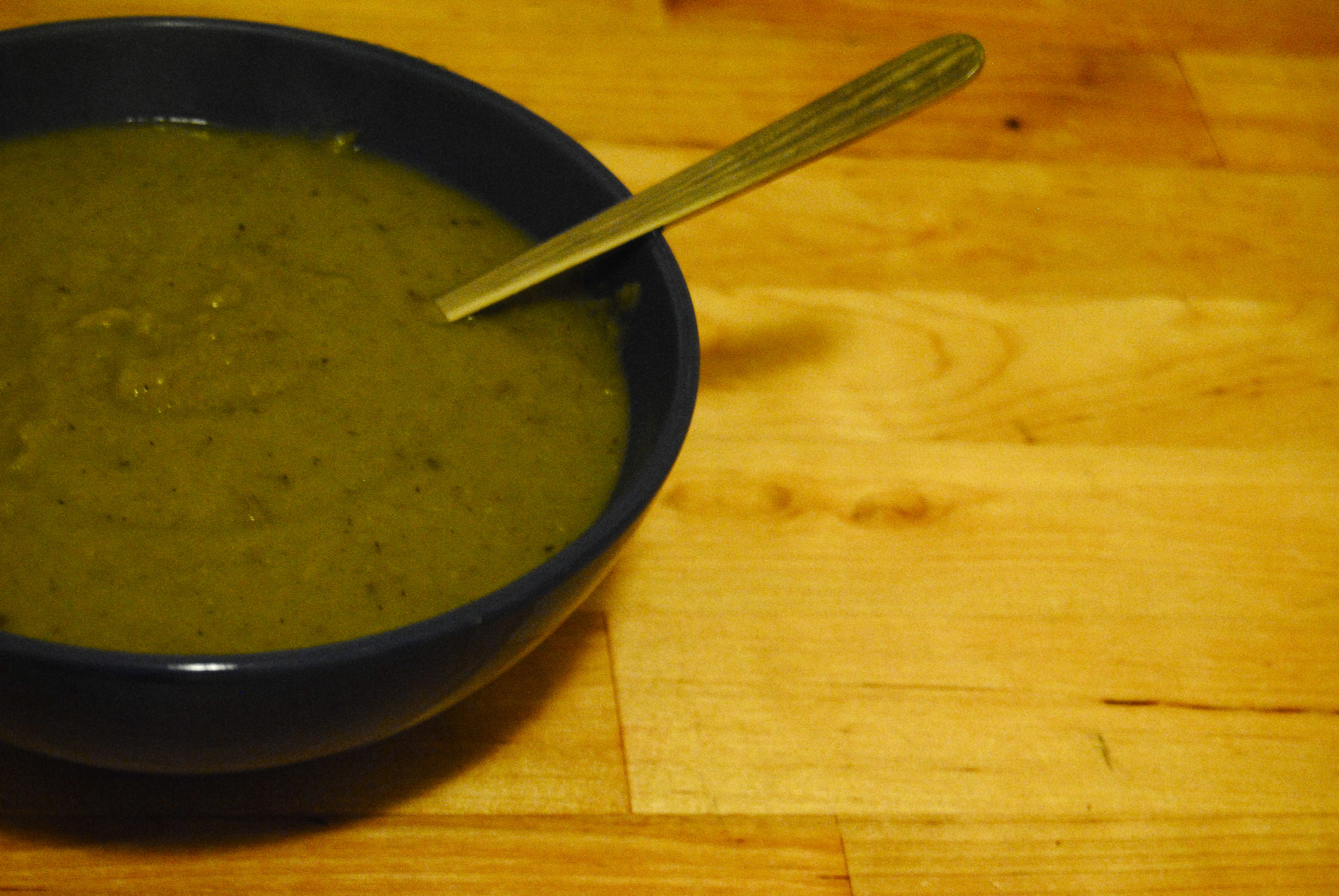 I should have kept my big mouth shut. After all that gloating about San Francisco summer arriving, it has been raining, raining, raining on and off for the last week. So, a warm bowl of soup seems more appropriate than a cold bowl of ice cream. This is Adam’s mom’s recipe for pea soup, and even though I didn’t grow up with it, it is just as comforting as if I had. This is the perfect kind of soup for “dunking.” You don’t even need a spoon– you can just eat it with a big chunk of sourdough bread. Well, more like several big chunks of bread. It’s thick, filling, and the strong taste of peas is somewhat offset by the thyme and rosemary that give it a a little something special.